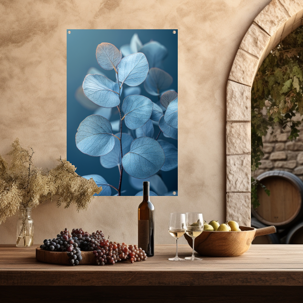 Blauwe eucalyptusbladeren in minimalistisch realisme tuinposter