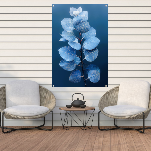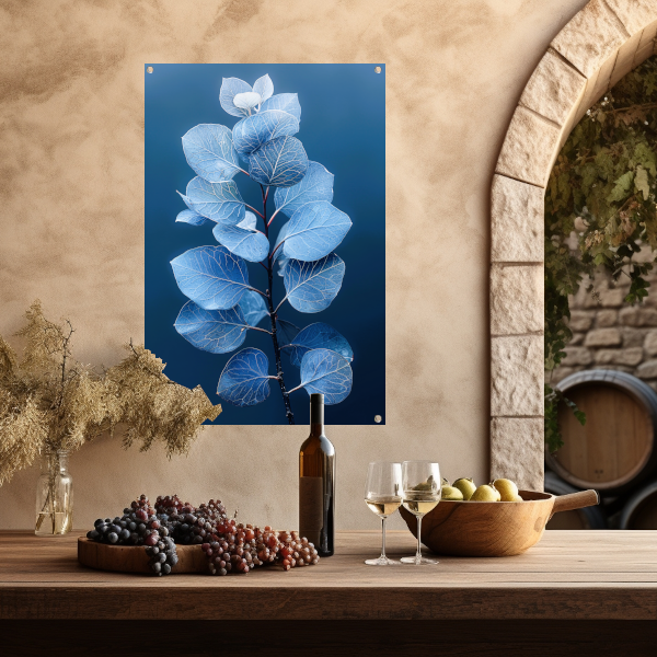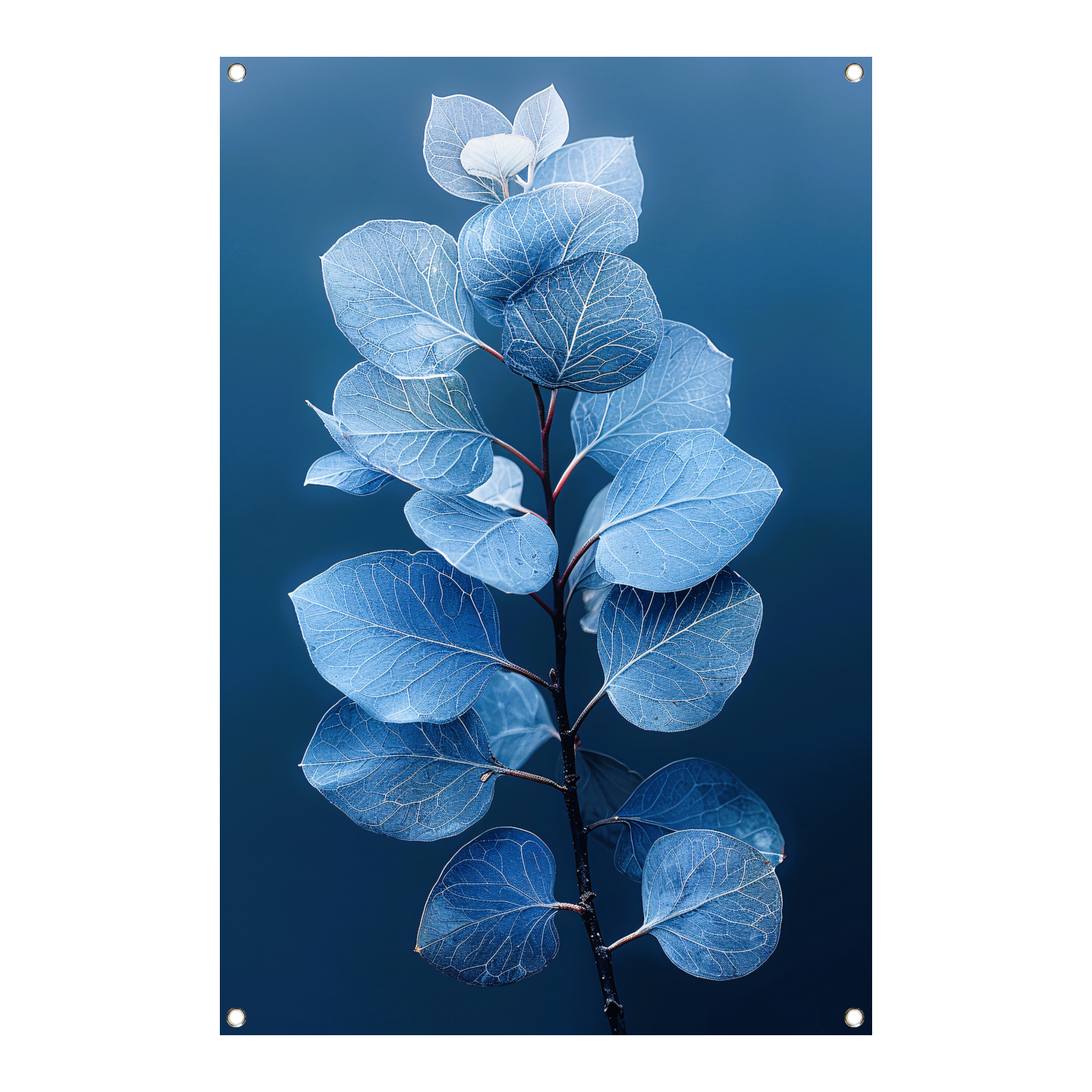 Blauwe eucalyptusbladeren tegen een zwarte achtergrond tuinposter