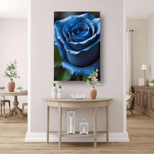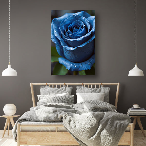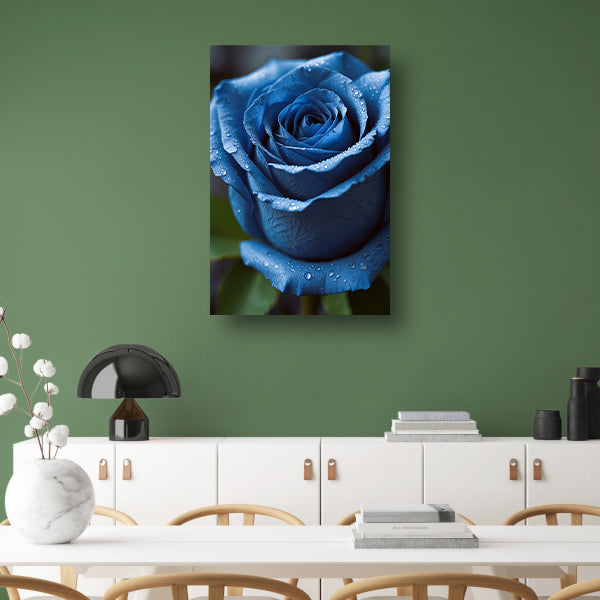 Blauwe roos bedauwd in ochtendlicht canvas met baklijst