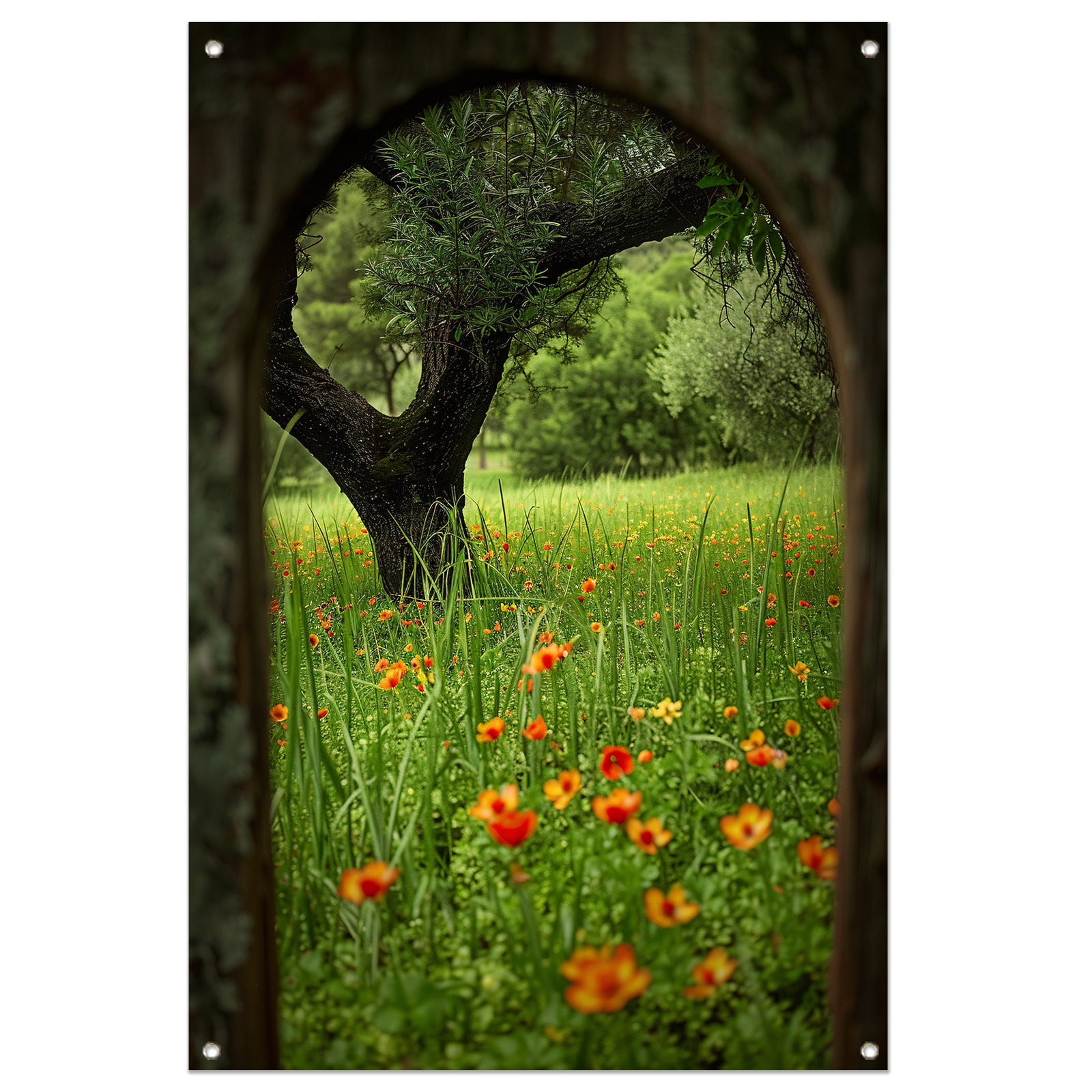 Bloemenweide met boom in boog tuinposter