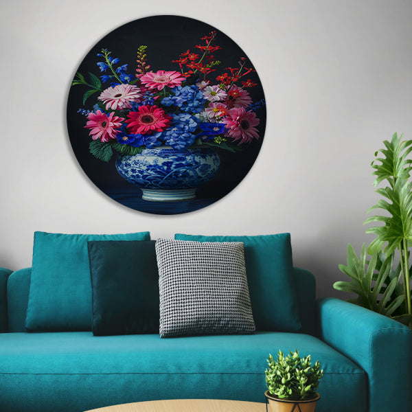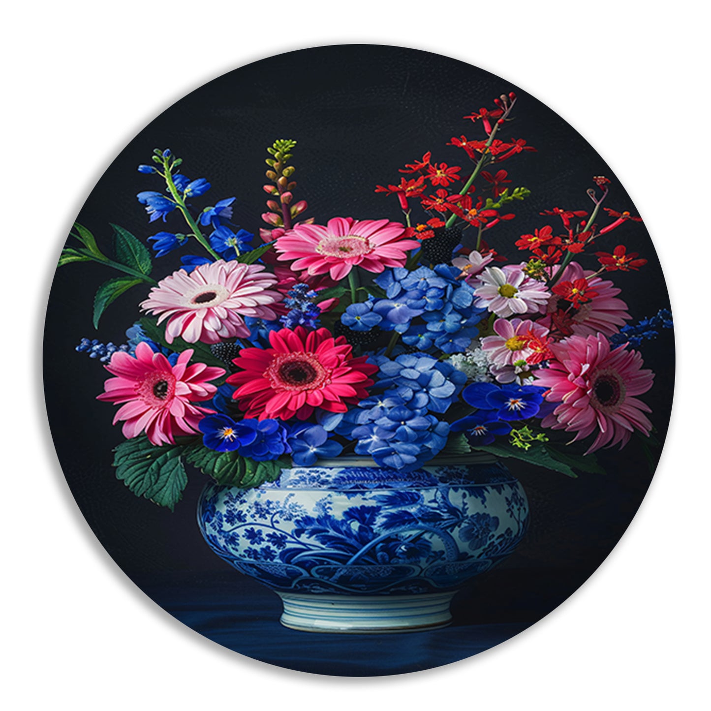 Bloemrijk stilleven in een Delfts blauwe vaas aluminium muurcirkel