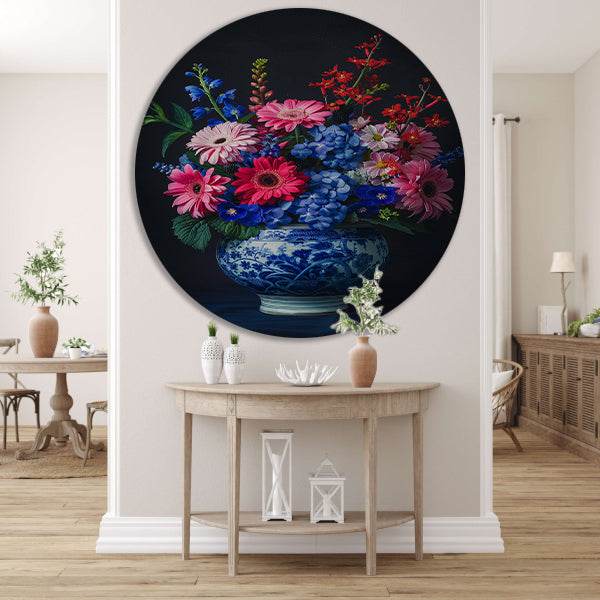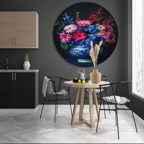 Breng de schoonheid en elegantie van een bloemrijk stilleven in een Delfts blauwe vaas in je huis met deze prachtige muurcirkel. Bestel vandaag nog en geef je interieur een vleugje Nederlandse flair!