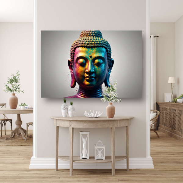 Boeddha Hoofd in Verrassende Kleurexplosie canvas met baklijst