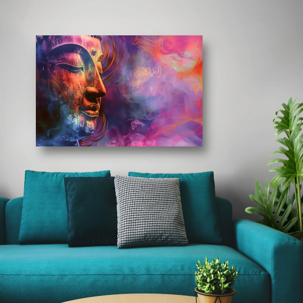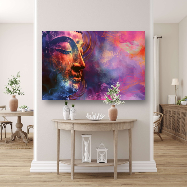 De afbeelding van Boeddha wordt omringd door abstracte vormen en levendige kleuren, waardoor het een echte eyecatcher is in elke kamer. De combinatie van traditionele en moderne elementen zorgt voor een unieke en inspirerende uitstraling.