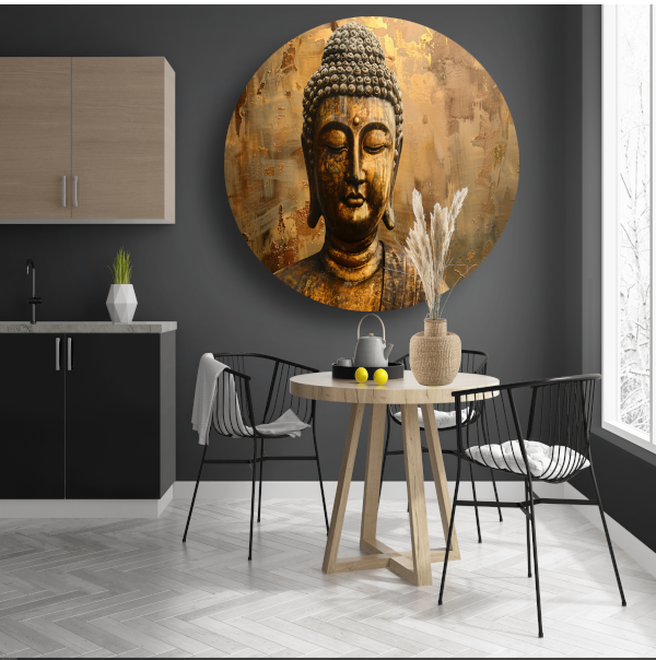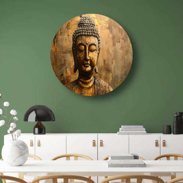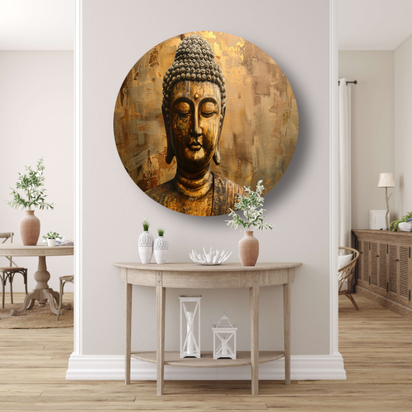 Boeddha in gouden gloed met rustieke achtergrond forex muurcirkel
