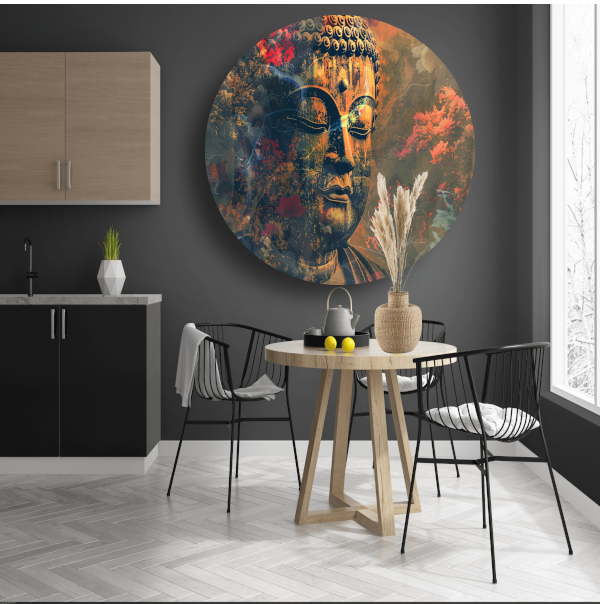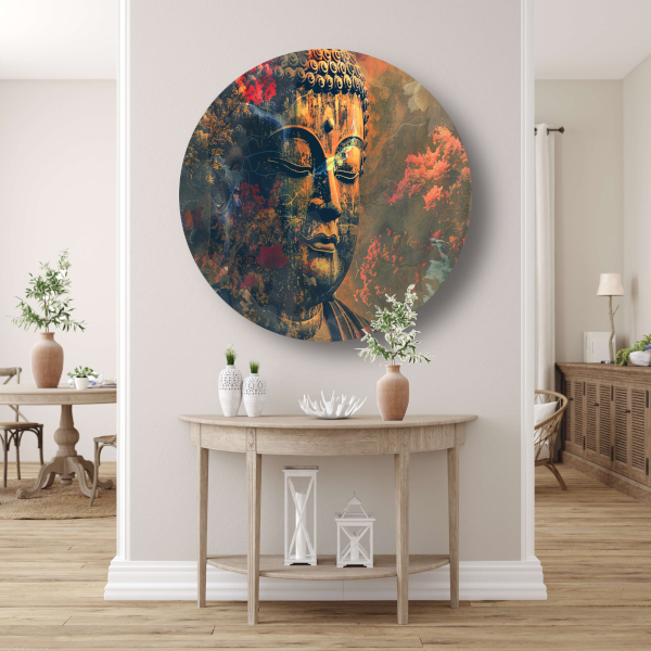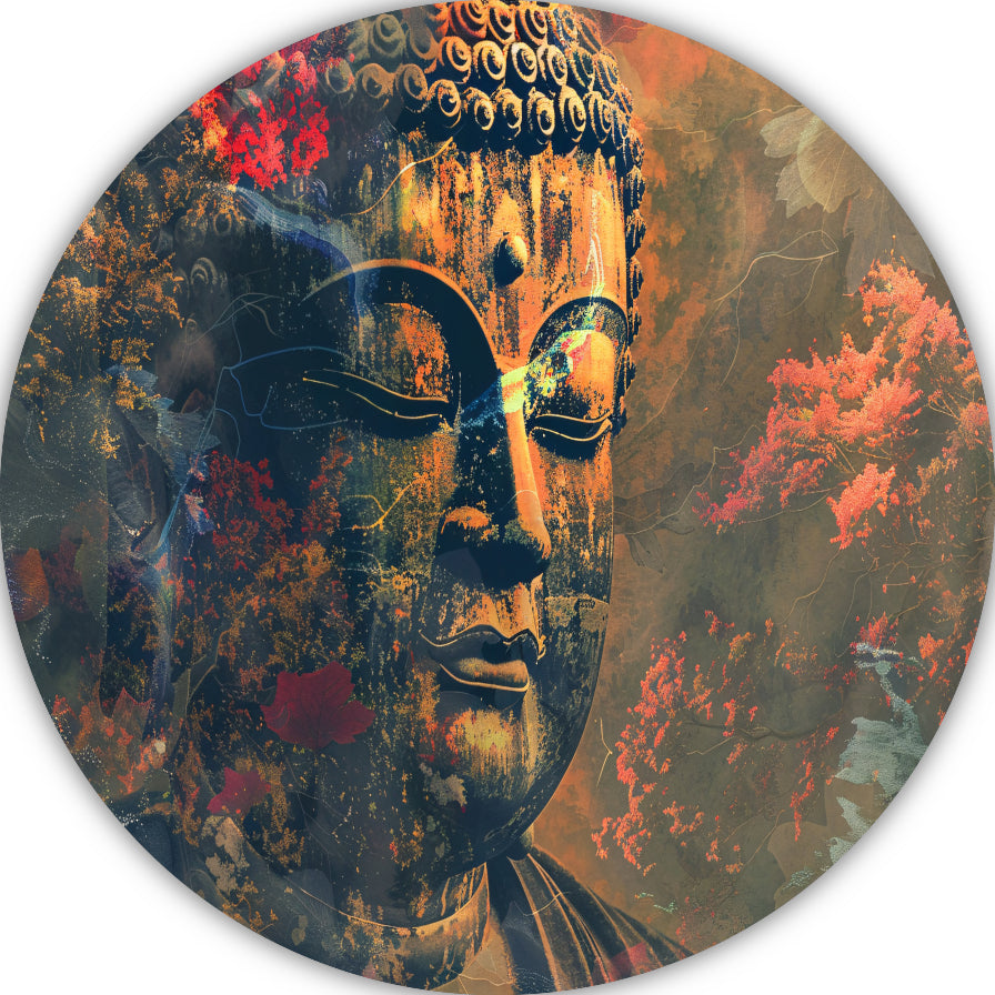 Boeddha in herfstpracht met kleurrijk bladerdek aluminium muurcirkel