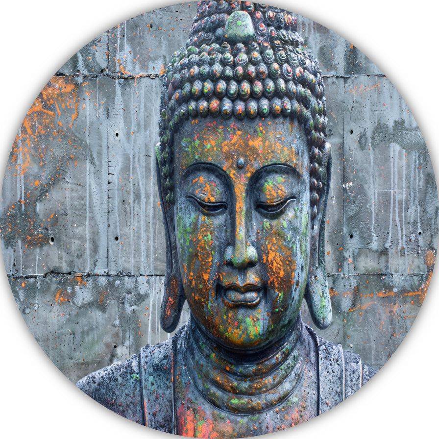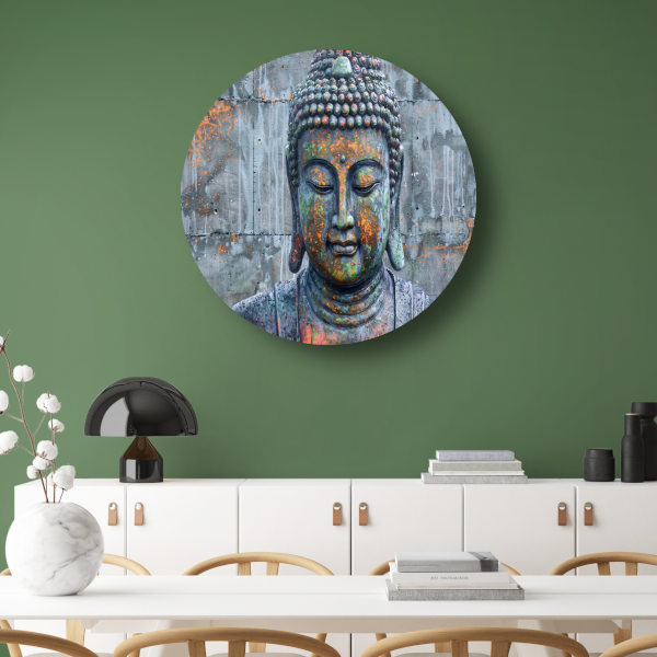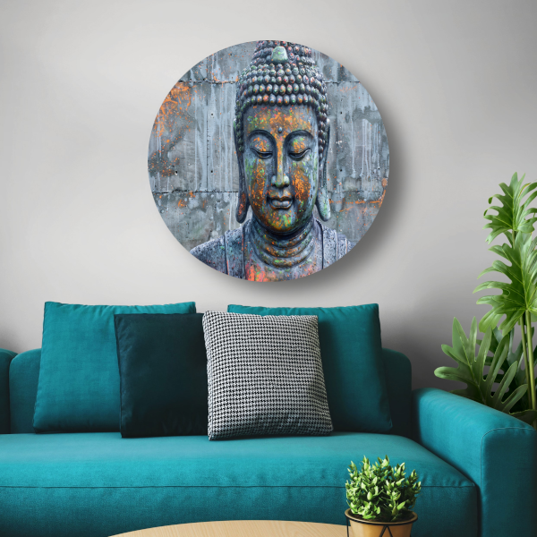 Boeddha Kunstwerk met Kleurrijke Betonnen Achtergrond aluminium muurcirkel