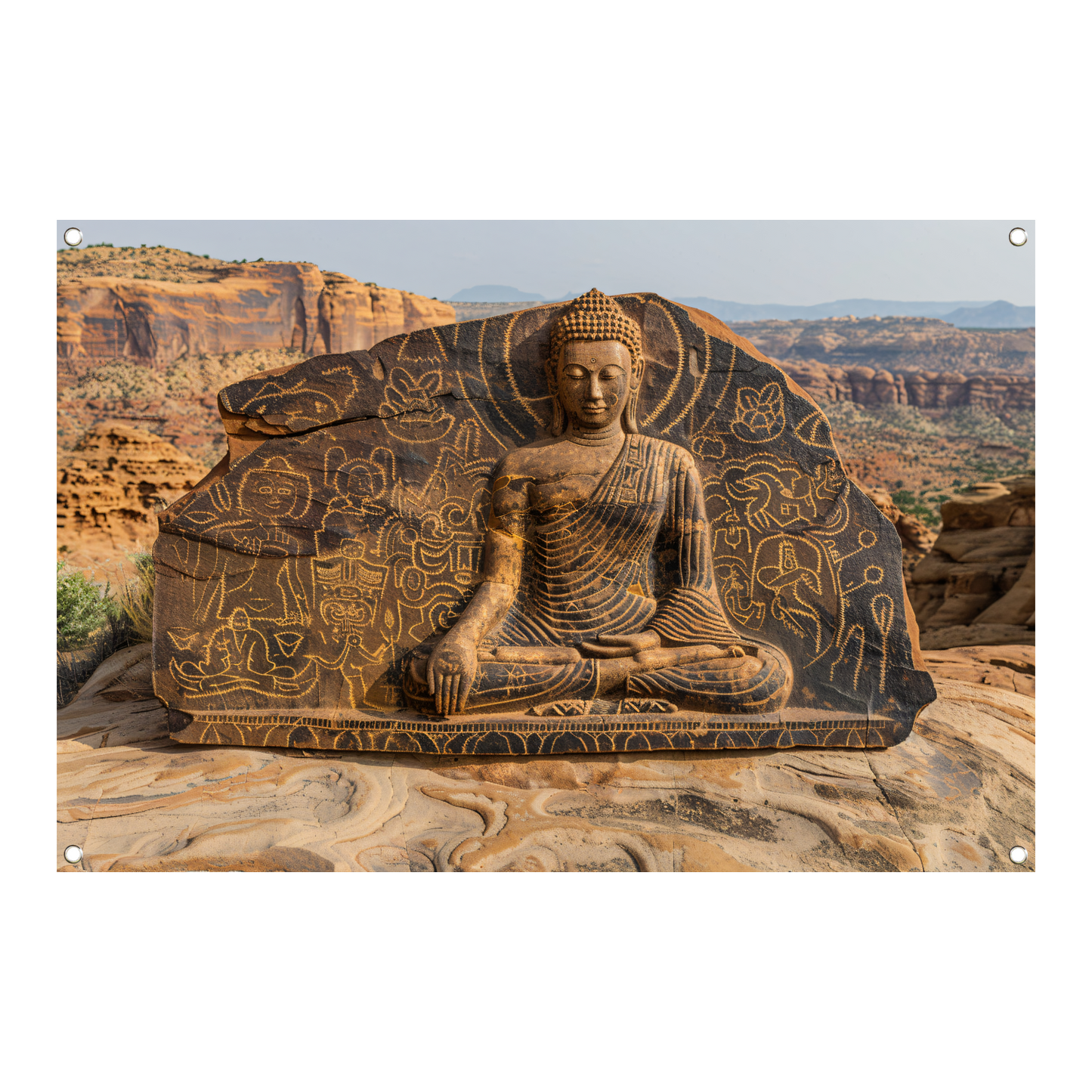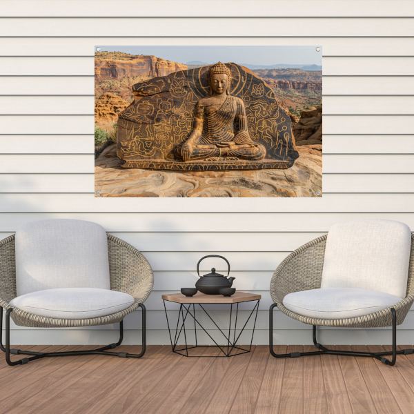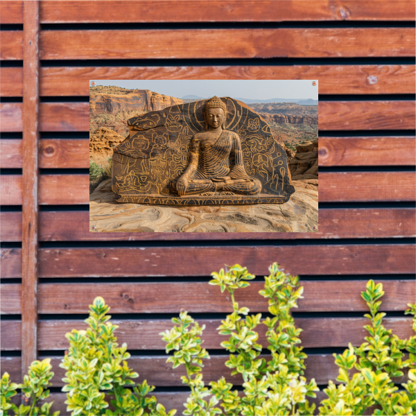 Haal de rust en spiritualiteit van Boeddha in huis met deze tuinposter en creëer een serene sfeer in jouw buitenruimte. Bestel nu en geniet van de schoonheid van deze Boeddha met Antieke Petrogliefen op Steen tuinposter.