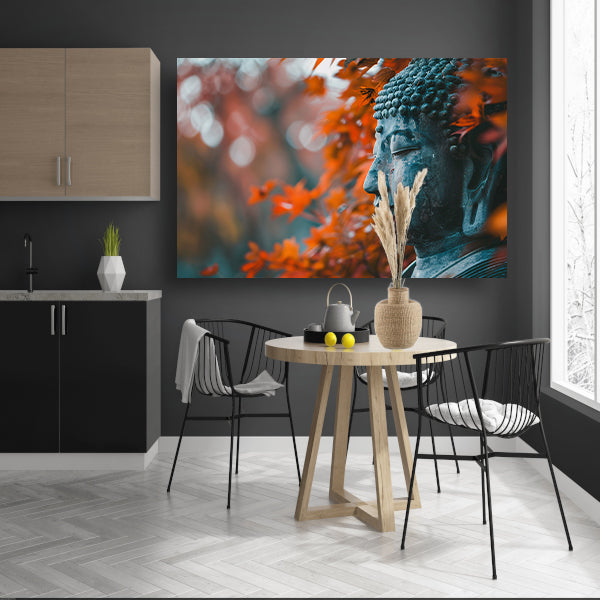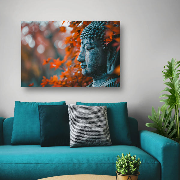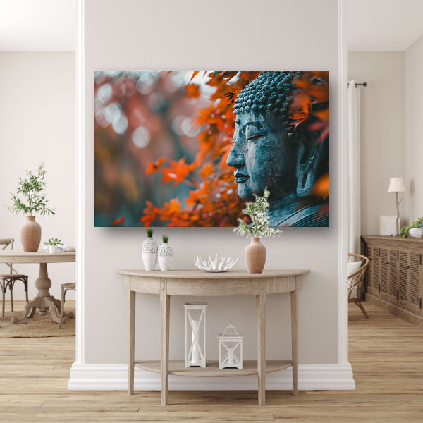 Boeddha omringd door herfstbladeren canvas