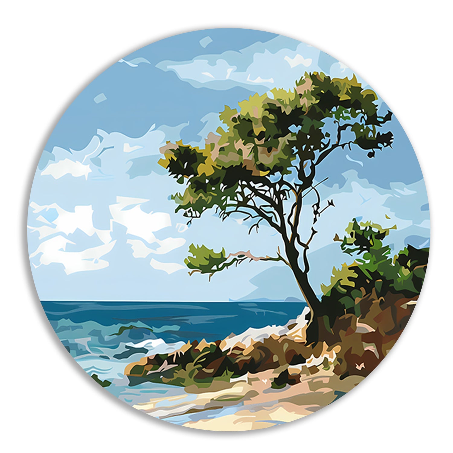 Boom aan de kust in popart stijl aluminium muurcirkel