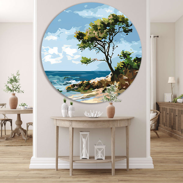 Het gebruik van hoogwaardig dibond zorgt ervoor dat deze muurcirkel duurzaam en krasbestendig is, zodat u er jarenlang van kunt genieten. Voeg een vleugje kunst en originaliteit toe aan uw interieur met deze prachtige boom aan de kust in popart stijl muurcirkel!