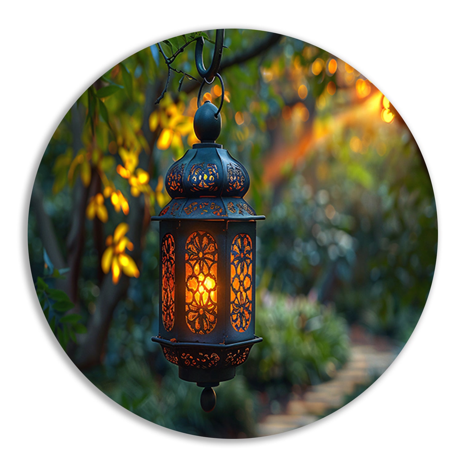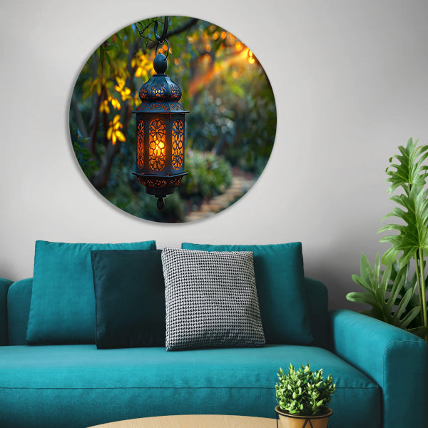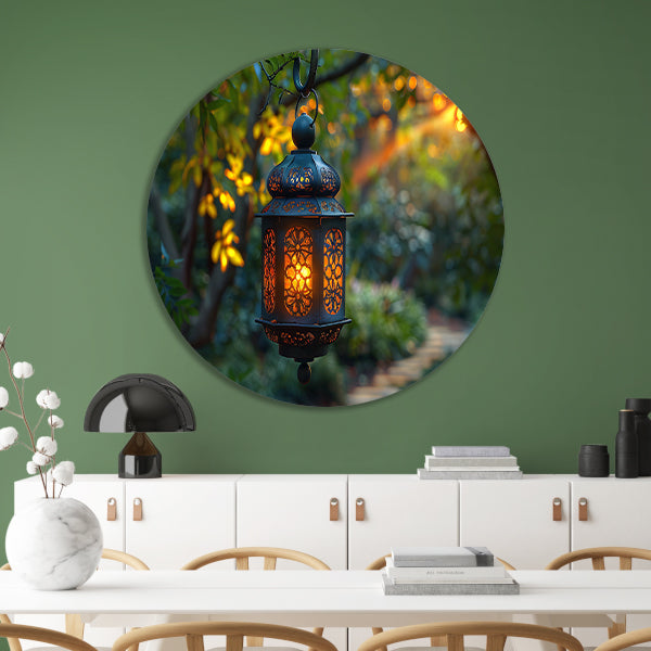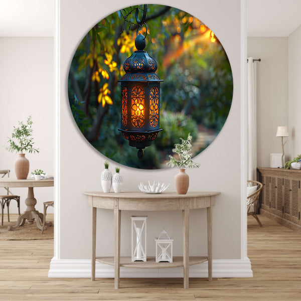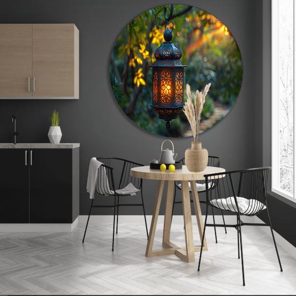 De afbeelding toont een idyllisch tafereel van een boslantaarn die oplicht in de schemering, waardoor een rustgevende en sfeervolle atmosfeer wordt gecreëerd. De kleuren en details spatten van de muurcirkel af, waardoor het een echte eyecatcher is in elke kamer.