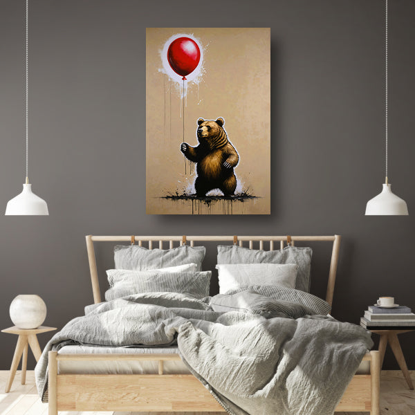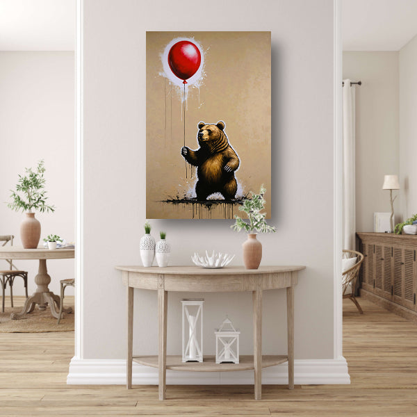 Bruine beer houdt een glanzende rode ballon vast canvas