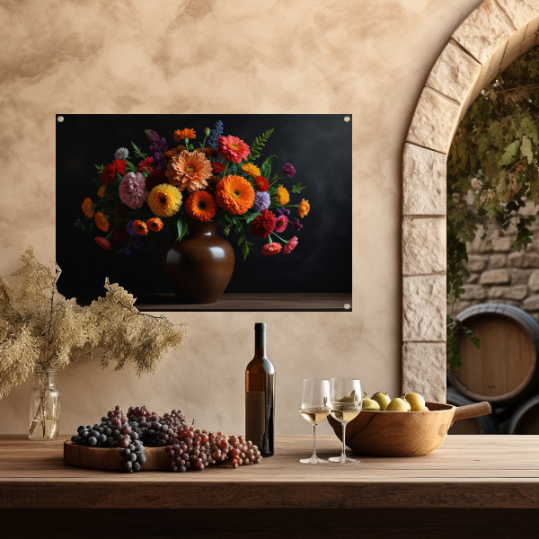 Bruine vaas met kleurrijke bloemenpracht tuinposter