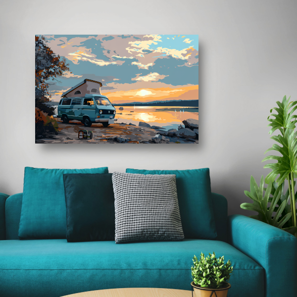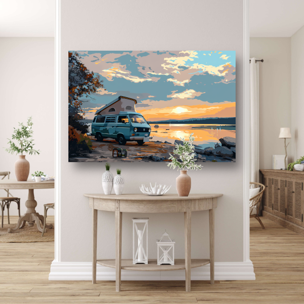 Het geheel wordt geleverd met een handige ophangplaat, waardoor je het schilderij eenvoudig aan de muur kunt bevestigen. Creëer een rustgevende sfeer in huis met deze prachtige afbeelding van een camper die tot rust komt op een idyllisch meer.