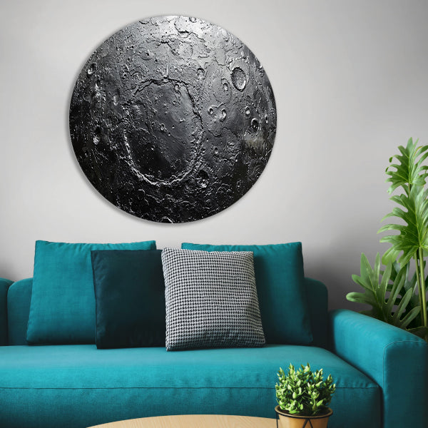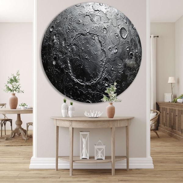 Breng de mystiek van de maan in huis met deze close-up maanoppervlak forex muurcirkel en geniet elke dag van de serene schoonheid van ons mysterieuze buurland in de ruimte.