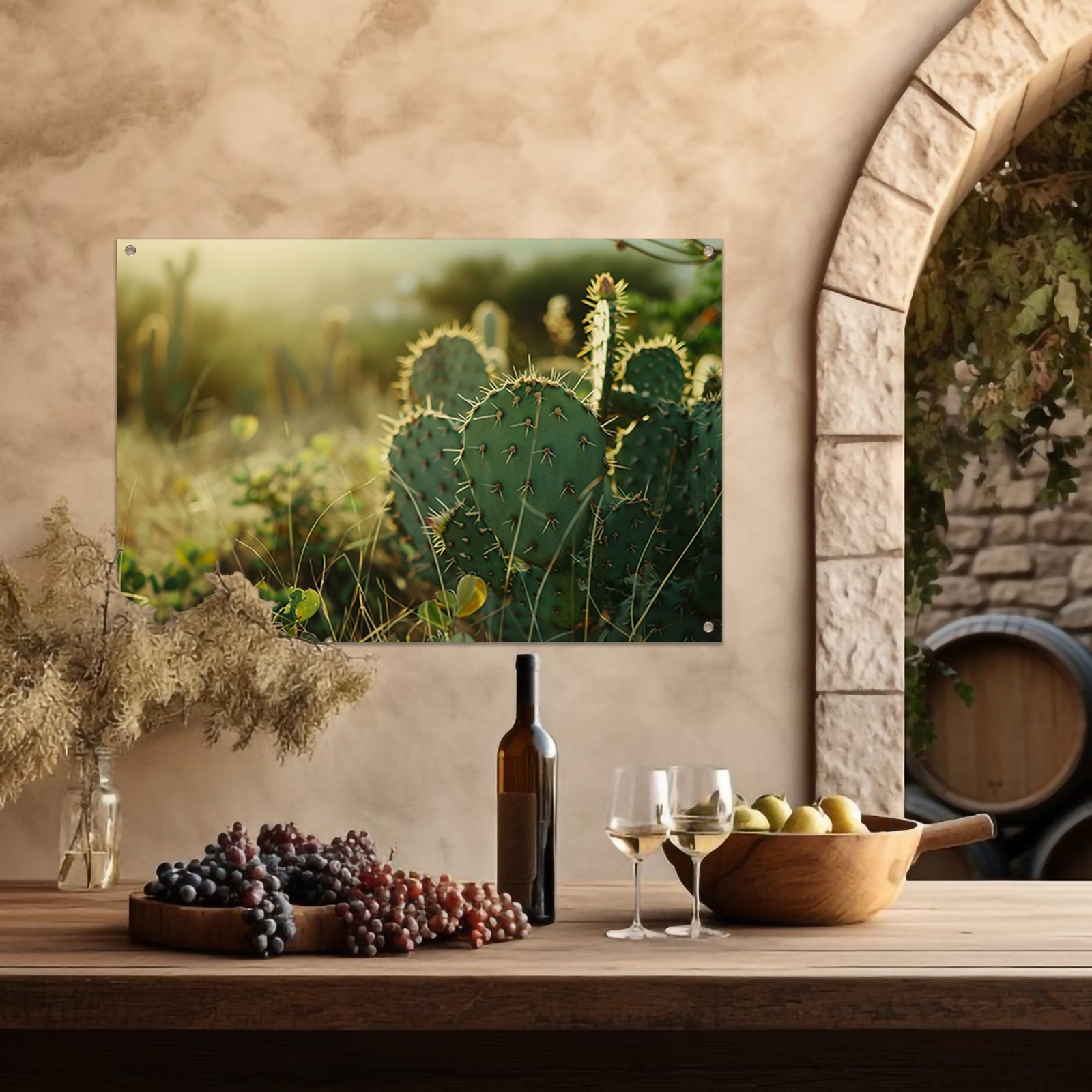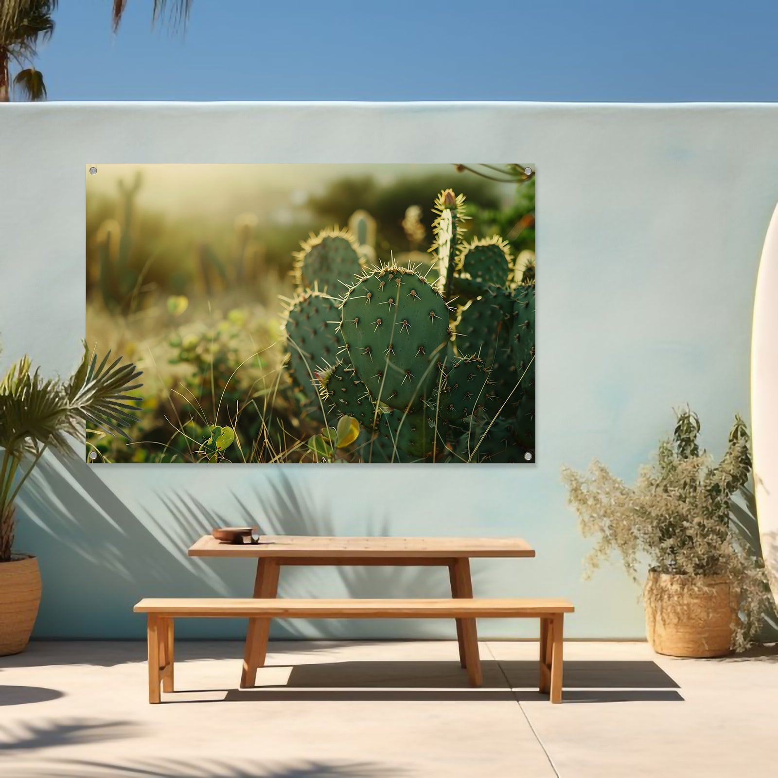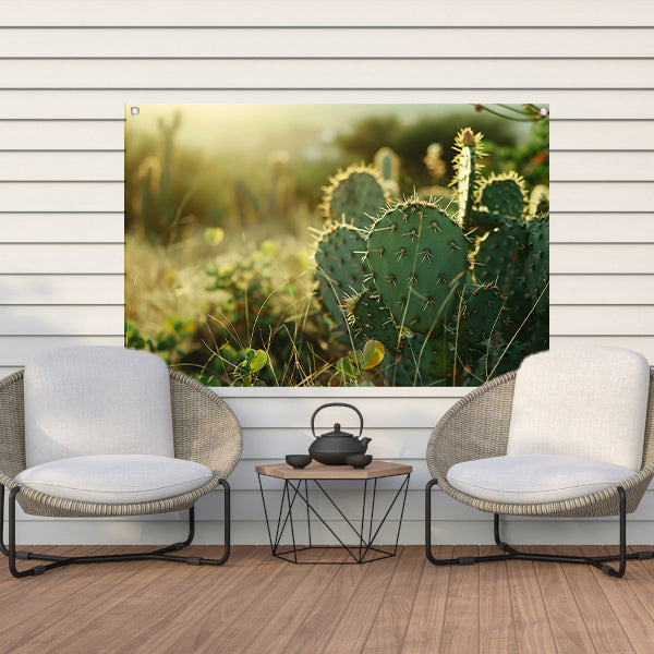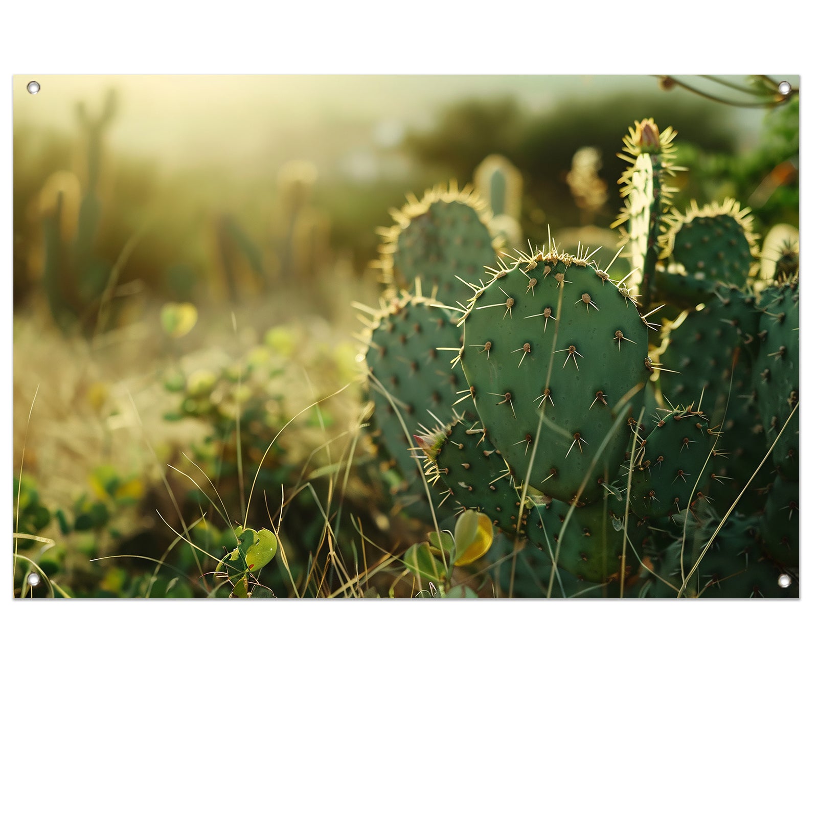 Close-up van cactusveld bij zonsopgang tuinposter