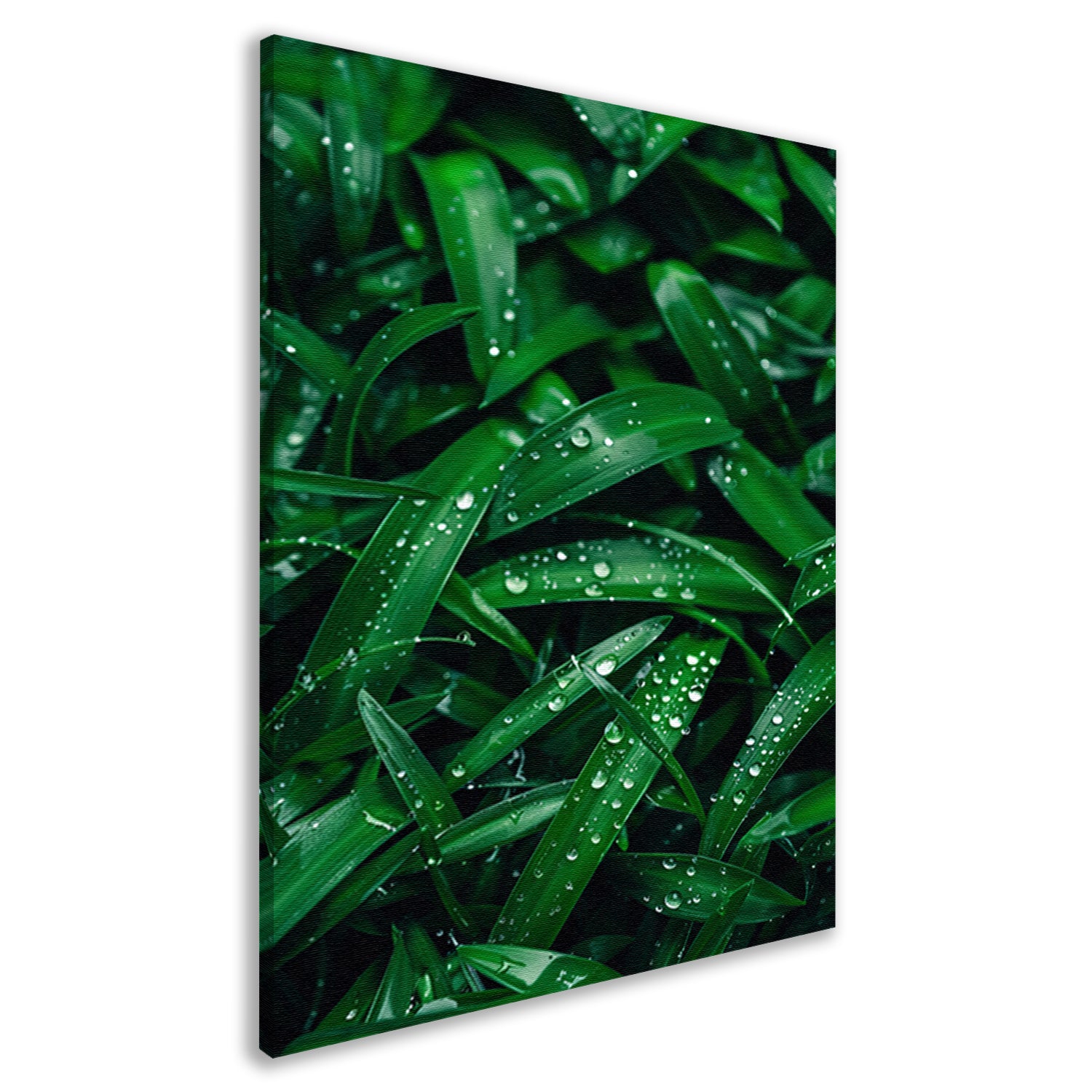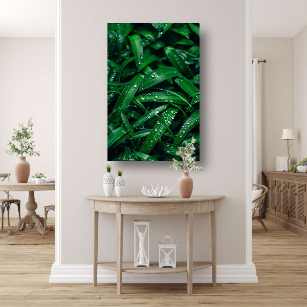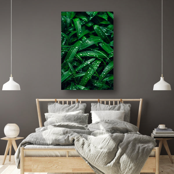 Close-up van dauwdruppels op groene bladeren canvas