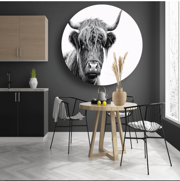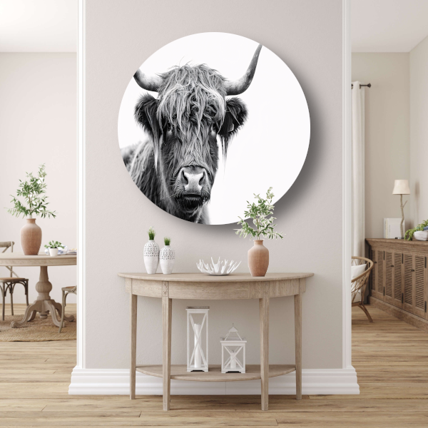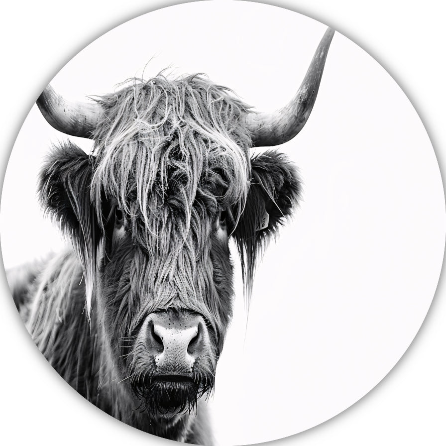 Close-up van een Schotse Hooglander in zwart-wit forex muurcirkel
