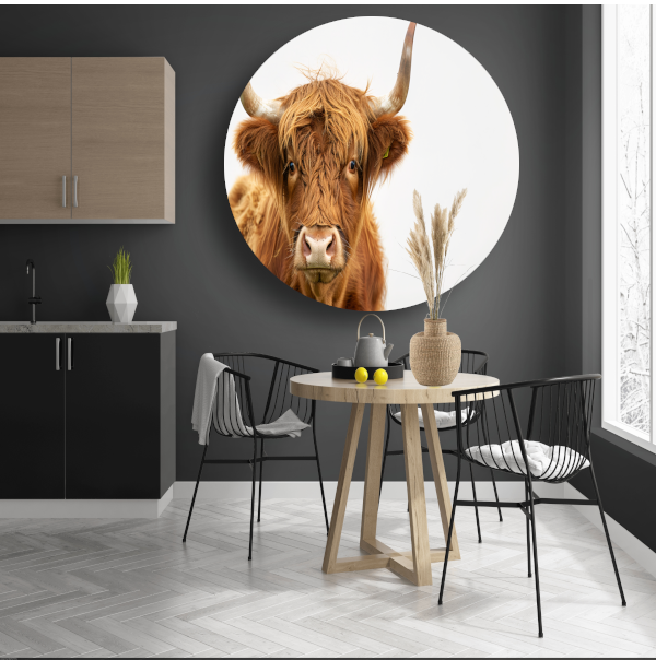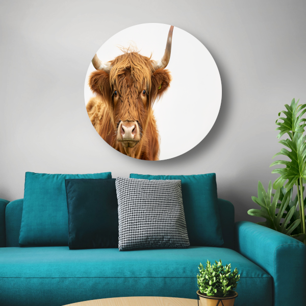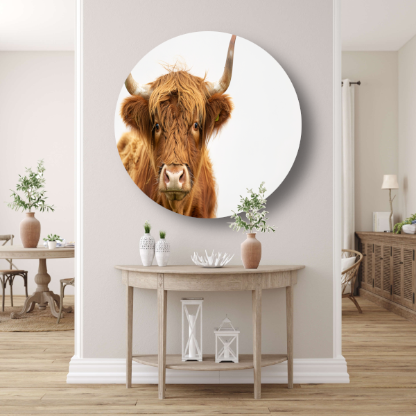 De aluminium muurcirkel is verkrijgbaar in verschillende maten, zodat je altijd een formaat kunt kiezen dat perfect past bij jouw interieur. Of je nu een liefhebber bent van dieren, natuur of gewoon op zoek bent naar een unieke wanddecoratie, deze muurcirkel is een aanwinst voor elk huis. Voeg een vleugje wildernis toe aan je interieur met deze prachtige close-up van een Schotse hooglander.