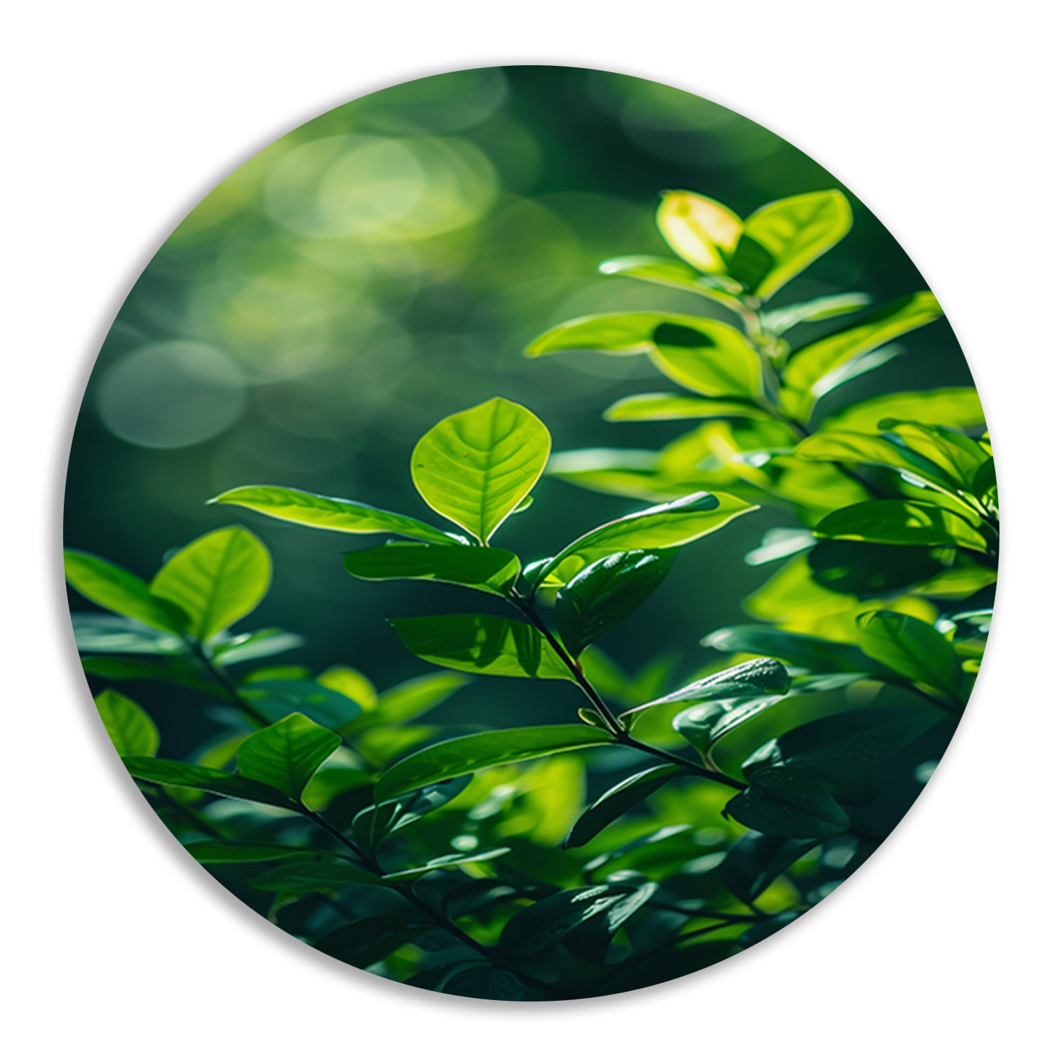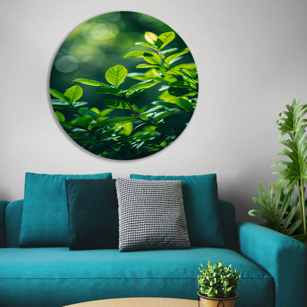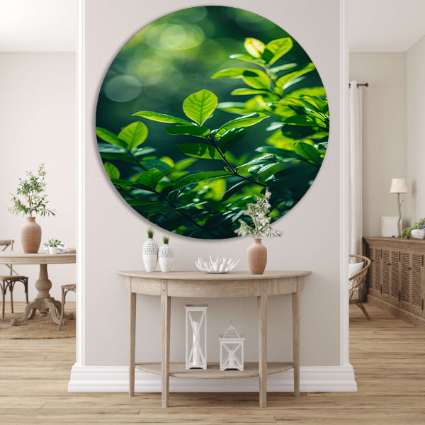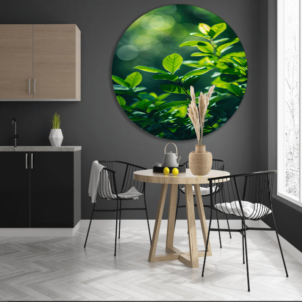 Close-up van groene bladeren in zonlicht forex muurcirkel