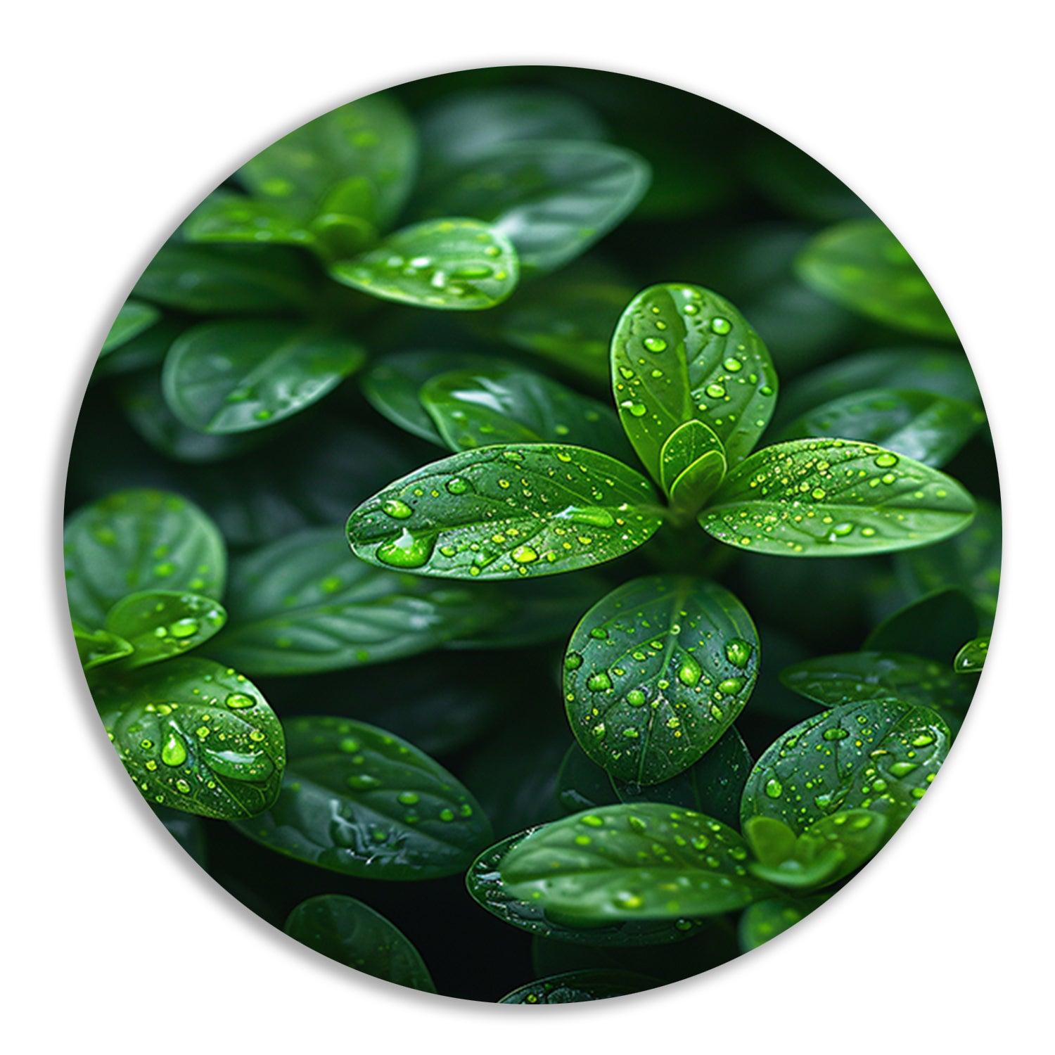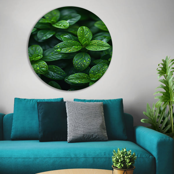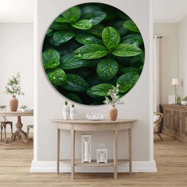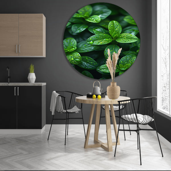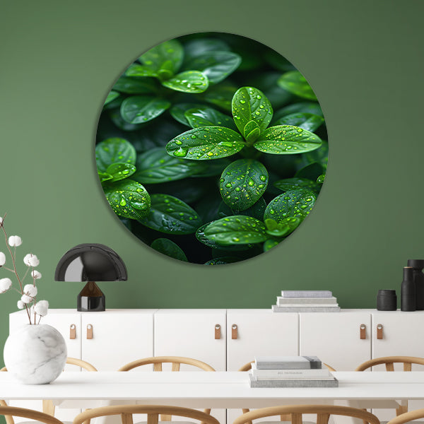 Close-up van groene bladeren met dauwdruppels forex muurcirkel