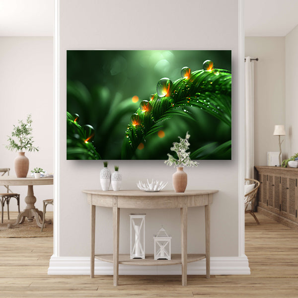 Dauwdruppels glinsterend op weelderige bladeren canvas met baklijst
