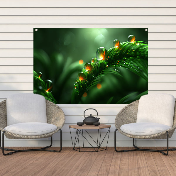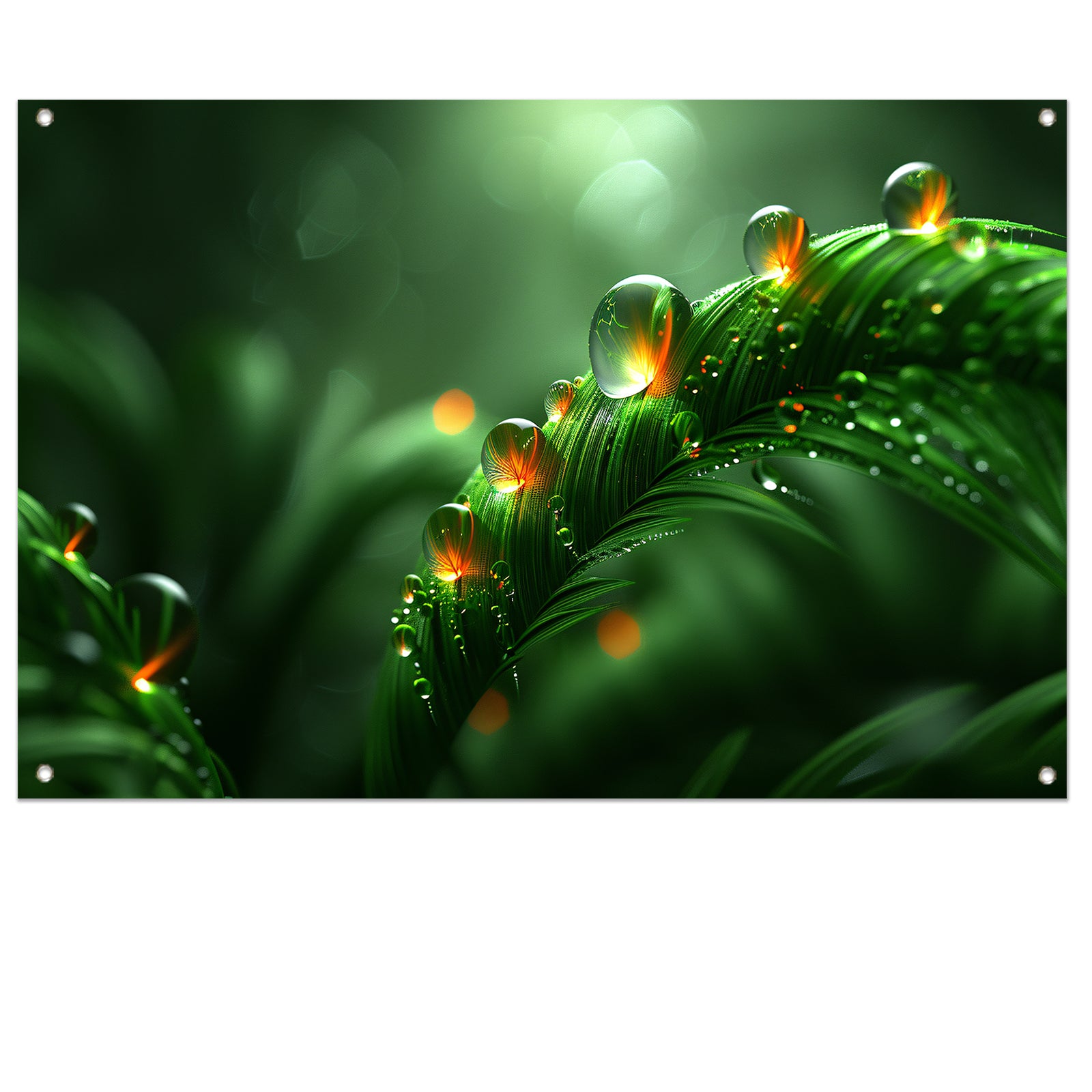 Dauwdruppels glinsterend op weelderige bladeren tuinposter