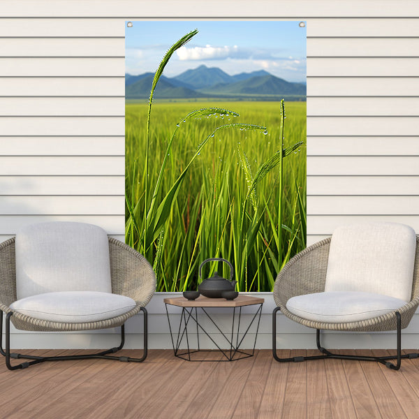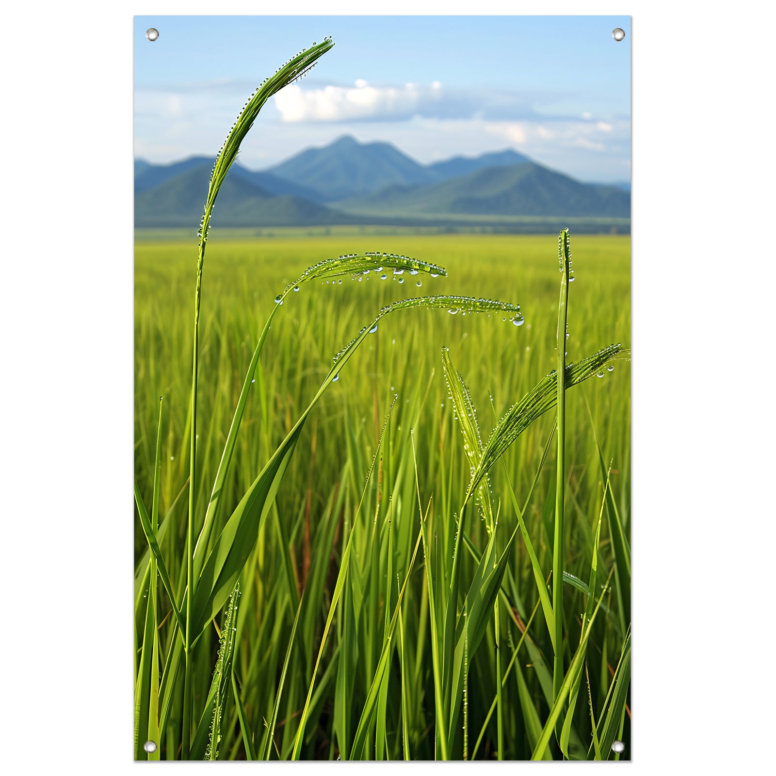 Dauwdruppels op groene grassprieten tuinposter