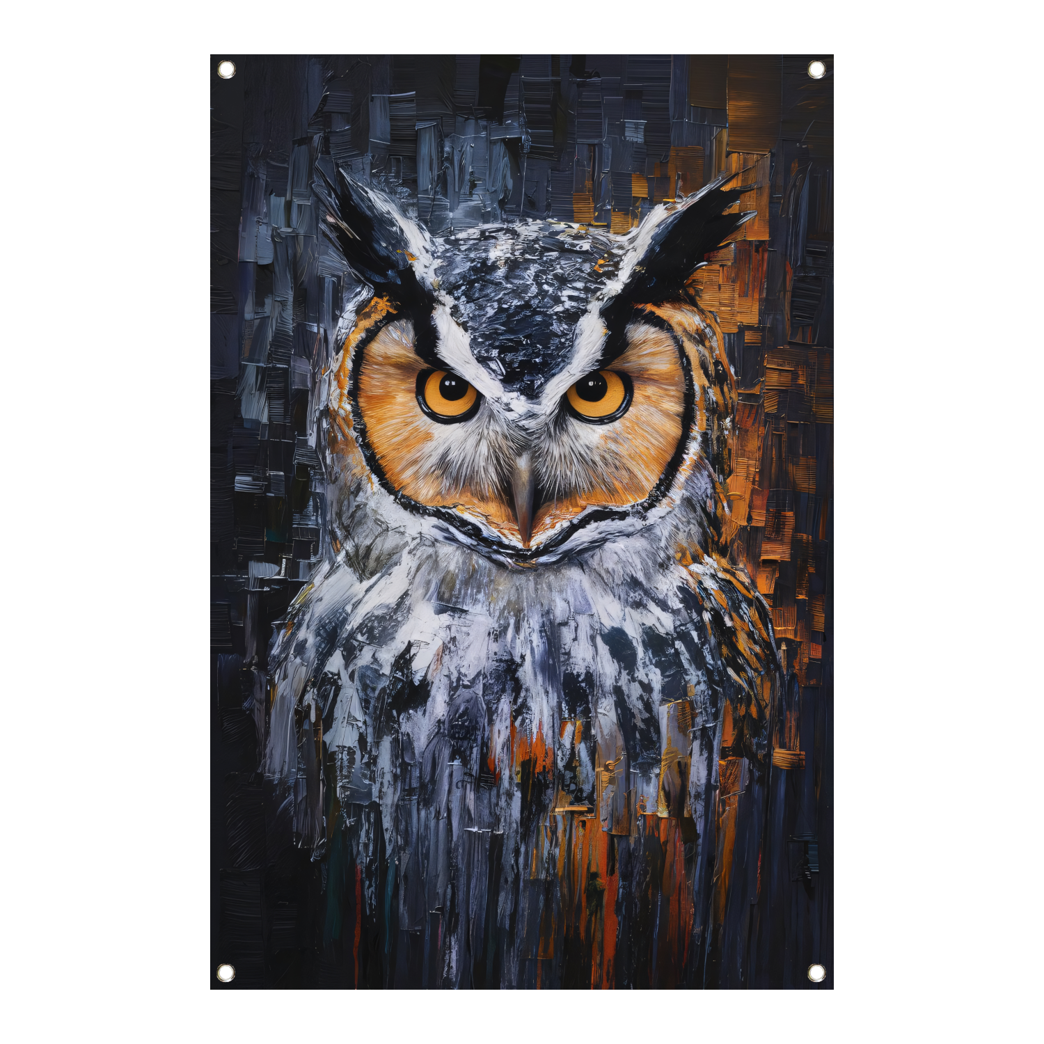 De Intense Blik van een Kleurrijke Uil tuinposter