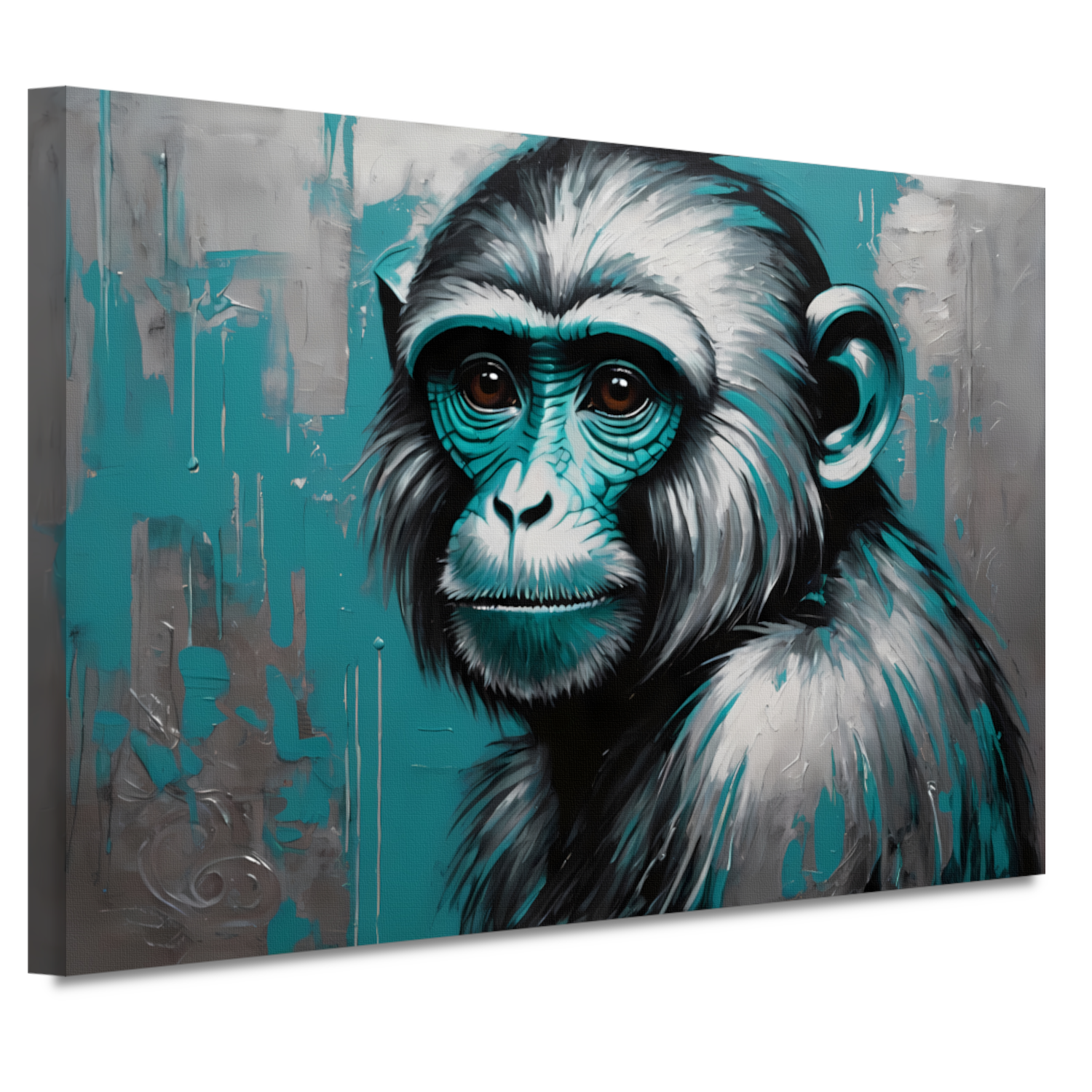 De kleuren van dit canvas zijn voornamelijk turquoise en verschillende tinten blauw, wat zorgt voor een rustgevend en tegelijkertijd opvallend effect. De aap is afgebeeld in een realistische stijl, waardoor het lijkt alsof hij zo uit de jungle is geplukt en op jouw muur is beland.
