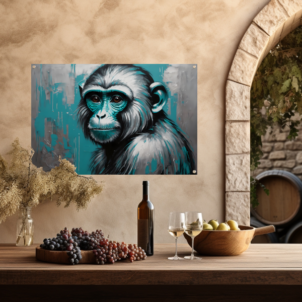 Met de De Intense Blik van een Turquoise Aap tuinposter haal je een uniek en opvallend stukje kunst in huis. Het is een echte aanwinst voor elke tuin en zal zeker de aandacht trekken van jouw gasten. Bestel nu en geef jouw tuin een kleurrijke en speelse touch!