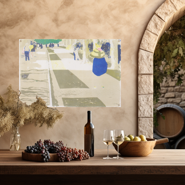 De stijl van deze tuinposter is gebaseerd op het werk van de Franse kunstenaar Édouard Vuillard. Zijn kenmerkende stijl van het gebruik van warme kleuren en gedetailleerde patronen komt terug in deze poster. Het geeft een vleugje elegantie en verfijning aan je tuin.