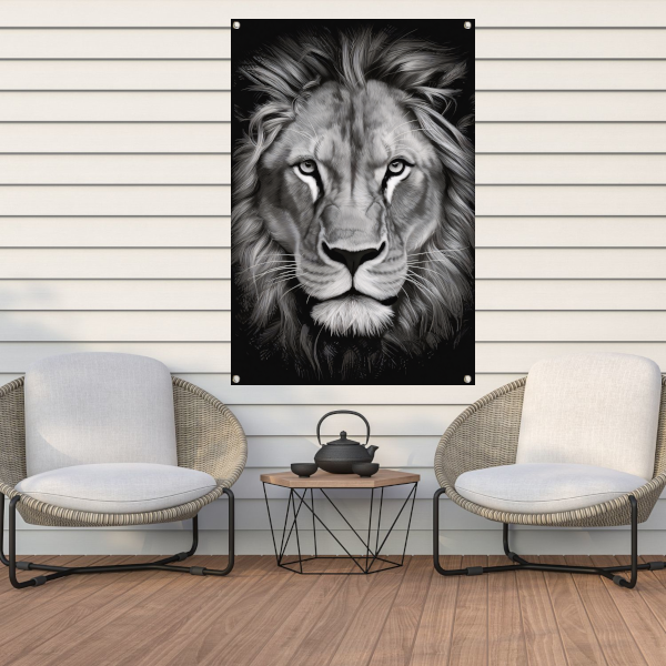 De Monochrome Blik van de Majestueuze Leeuw tuinposter