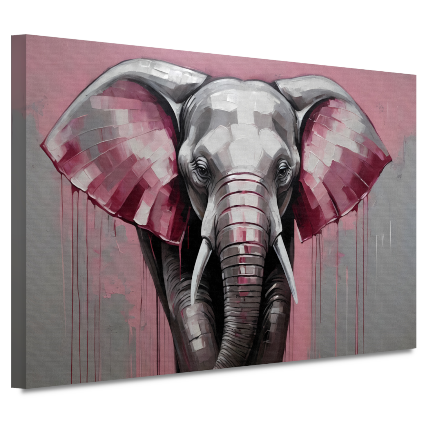 Het thema van dit kunstwerk is de majestueuze olifant, een symbool van kracht en wijsheid. De roze accenten voegen een speels en verrassend element toe aan het schilderij, waardoor het een echte eyecatcher wordt. De combinatie van de zachte roze tinten en de krachtige olifant zorgt voor een uniek contrast dat de aandacht trekt.