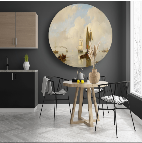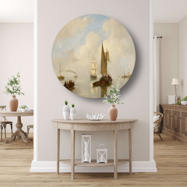 De Zeeuwsche stroomen bij stil weder, in t verschiet eene stoomboot - Andreas Schelfhout aluminium muurcirkel