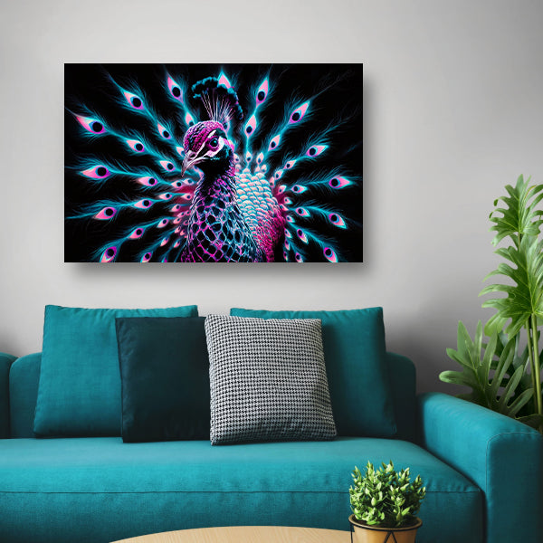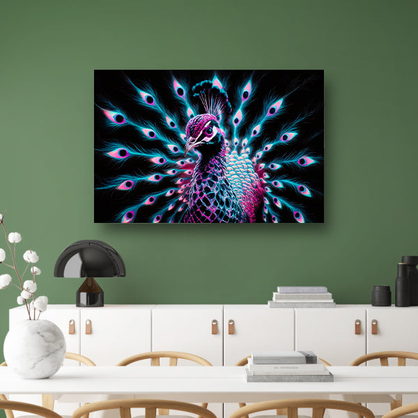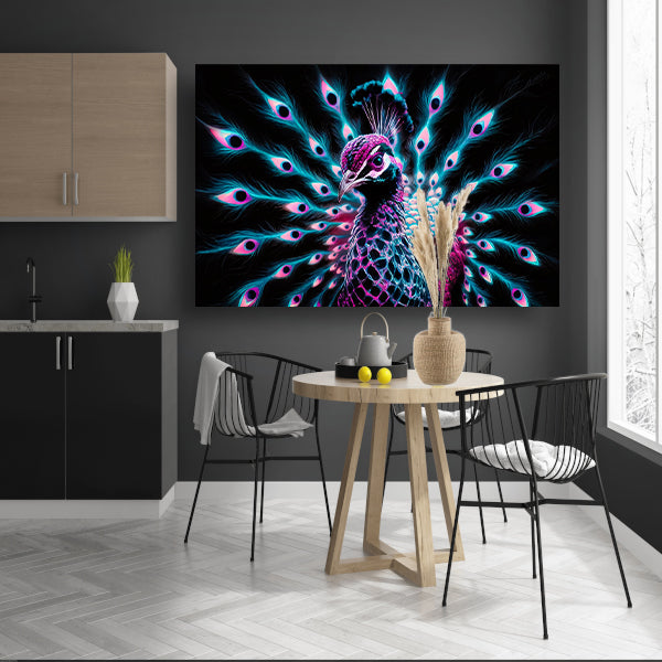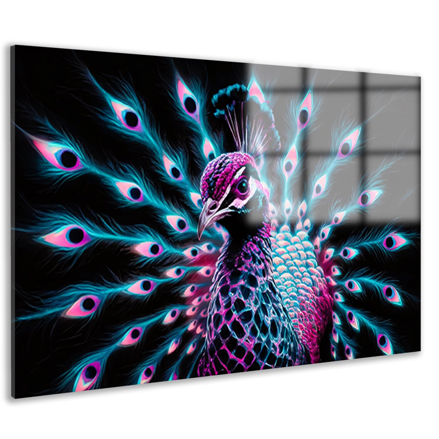 Digitale kunst van een kleurrijke pauw in neon acrylglas
