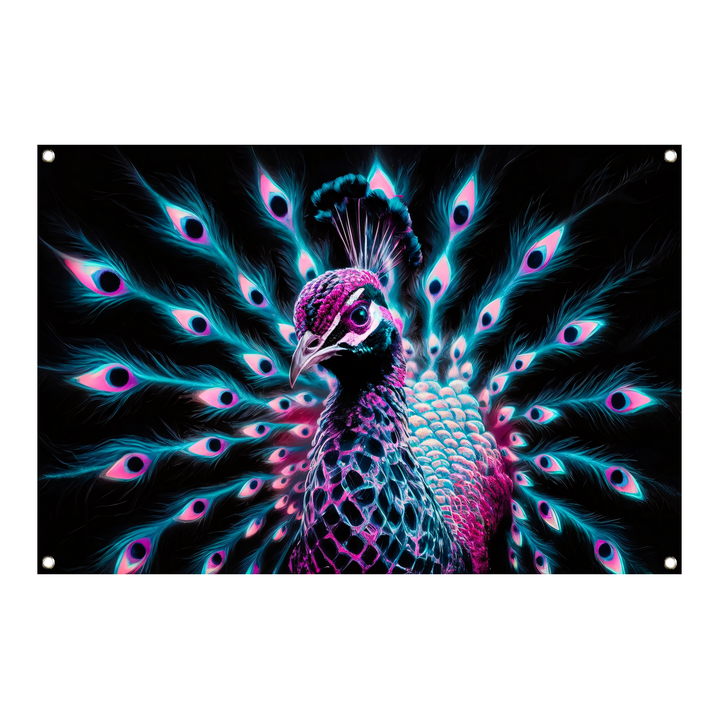 Digitale kunst van een kleurrijke pauw in neon tuinposter