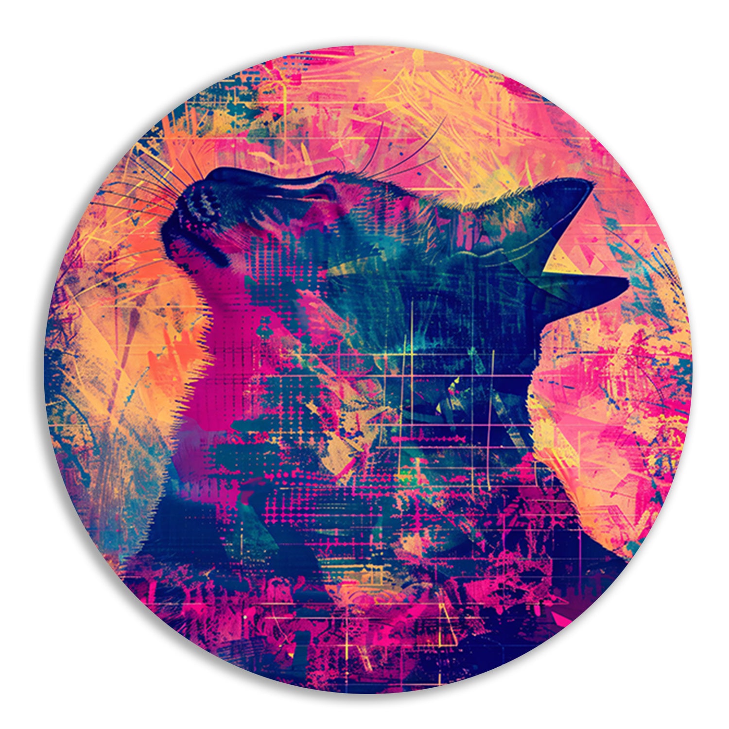 Digitale kunst van kat in levendige kleuren aluminium muurcirkel