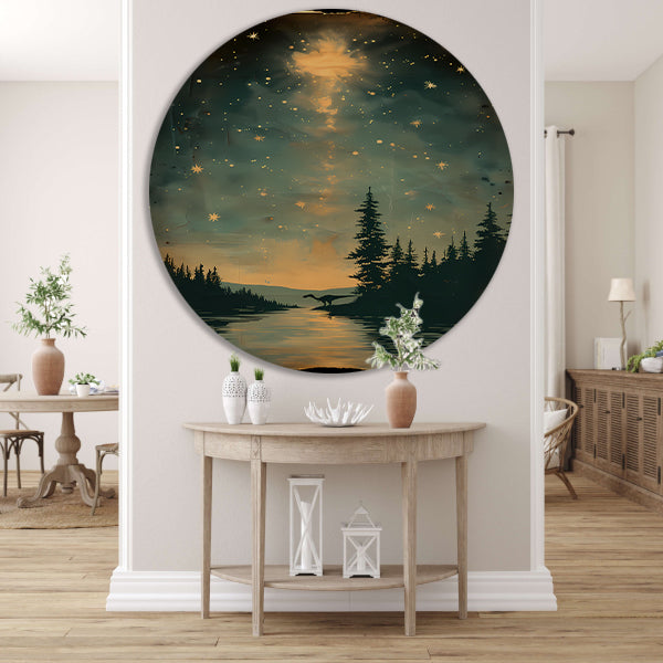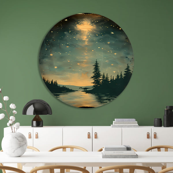 Deze muurcirkel is verkrijgbaar in allerlei formaten, waardoor hij geschikt is voor elke ruimte in huis. Of je nu een klein hoekje wilt opfleuren of een echte eyecatcher aan de muur wilt hangen, met deze muurcirkel kun je alle kanten op. De afbeelding van de dinosaurus bij maanlicht aan het water zorgt voor een mysterieuze en sfeervolle look in elke kamer.