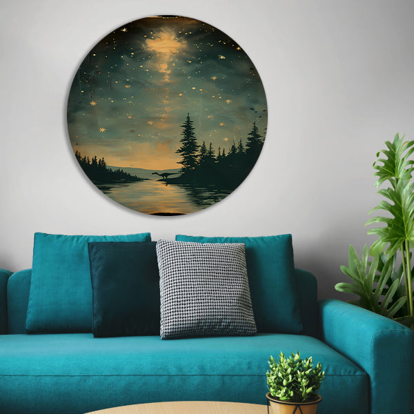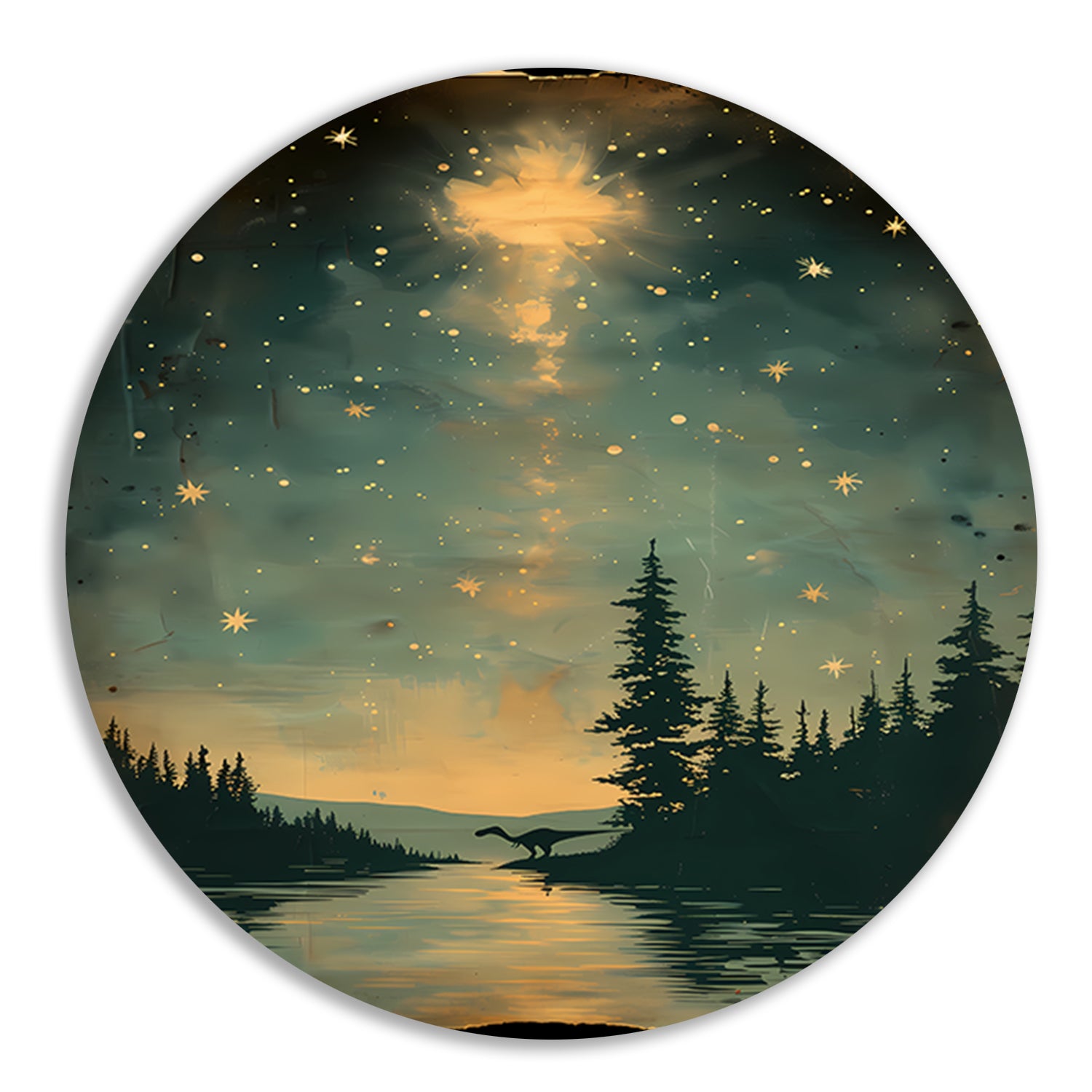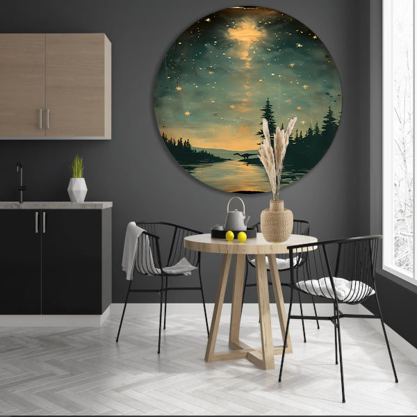 Breng een vleugje prehistorische sfeer in huis met deze prachtige muurcirkel en geniet elke dag van het bijzondere tafereel van de dinosaurus bij maanlicht aan het water. Perfect voor liefhebbers van dinosaurussen en unieke interieurdecoratie. Bestel nu en geef jouw interieur een originele touch!