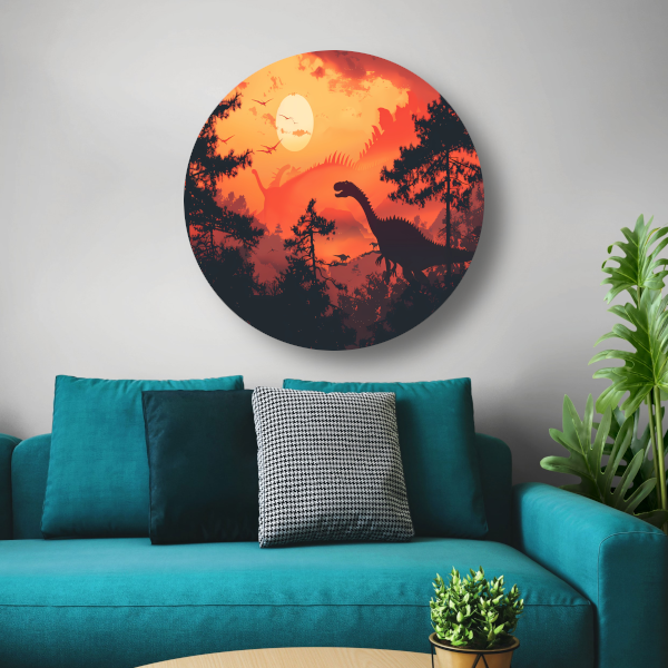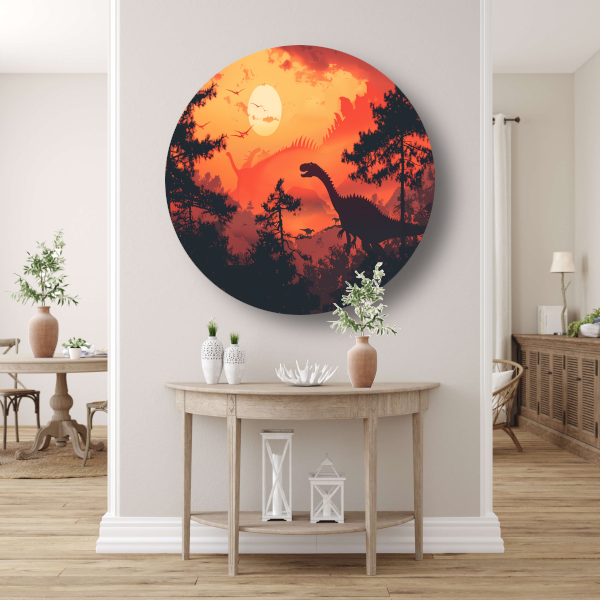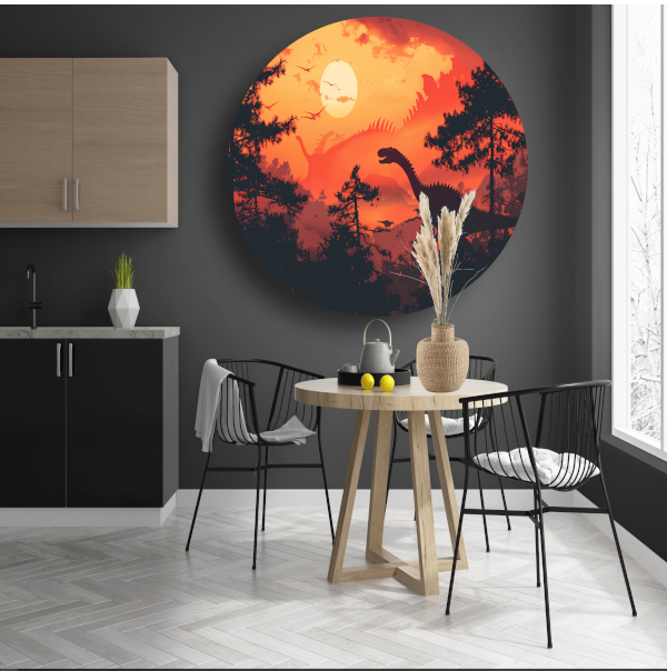 Verkrijgbaar in diverse formaten, zodat je de perfecte afmeting voor jouw wand kunt kiezen. Of je nu op zoek bent naar een opvallend statement piece of een subtiele toevoeging aan je interieur, deze Dinozonsondergang muurcirkel past in iedere ruimte.