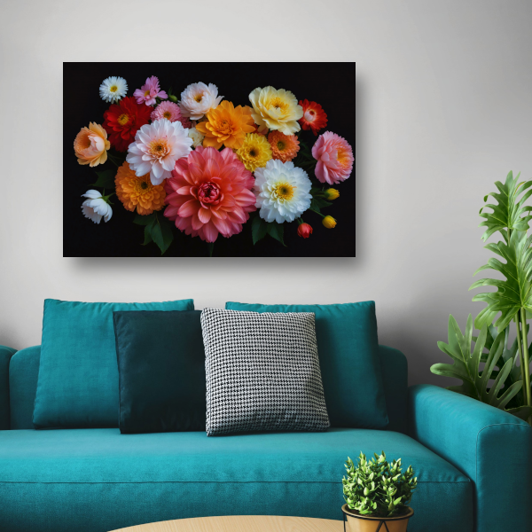 Diverse Kleurrijke Bloemen op Donkere Achtergrond canvas met baklijst