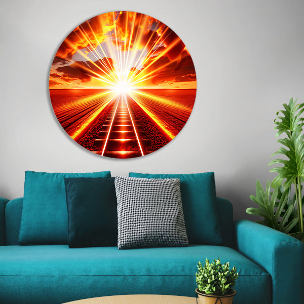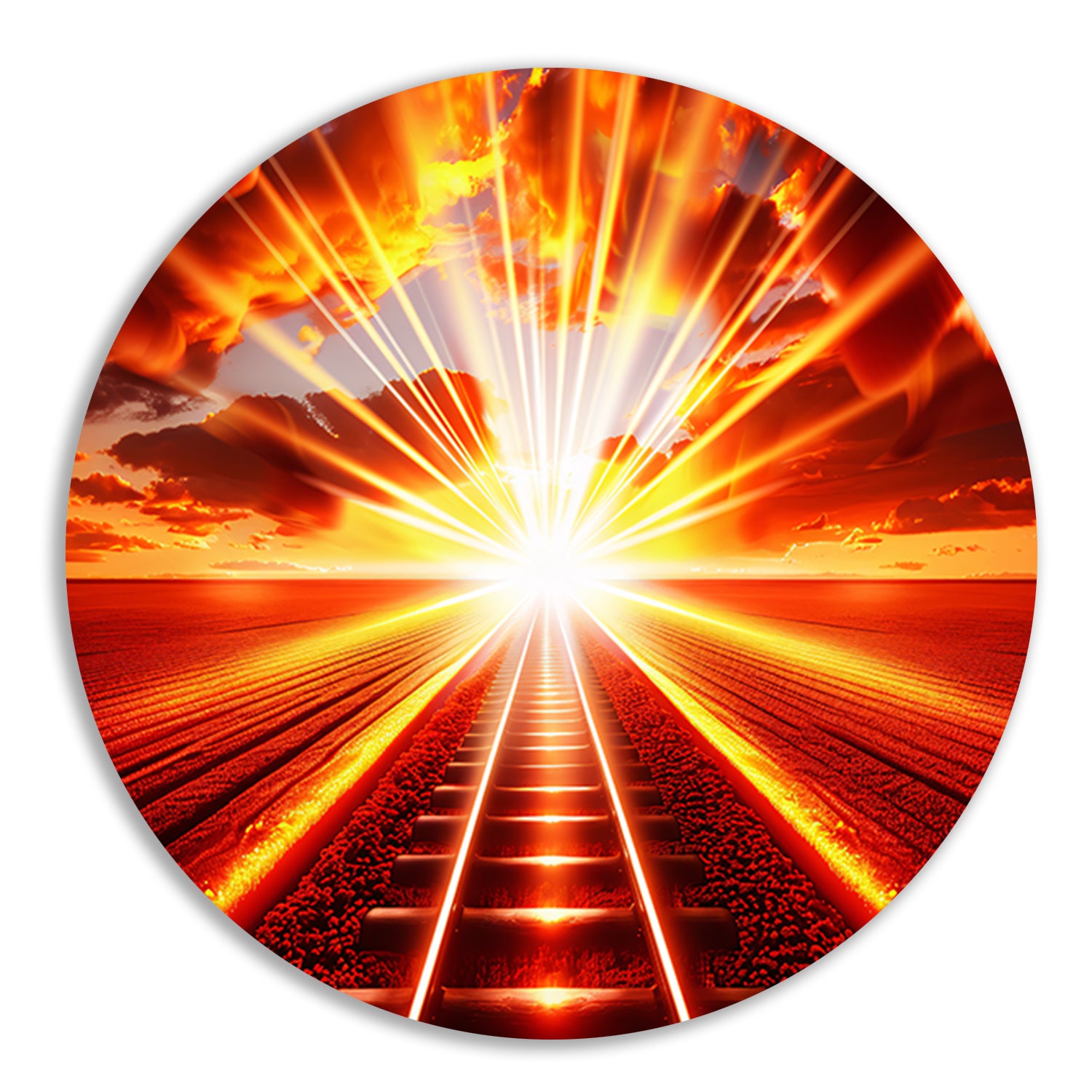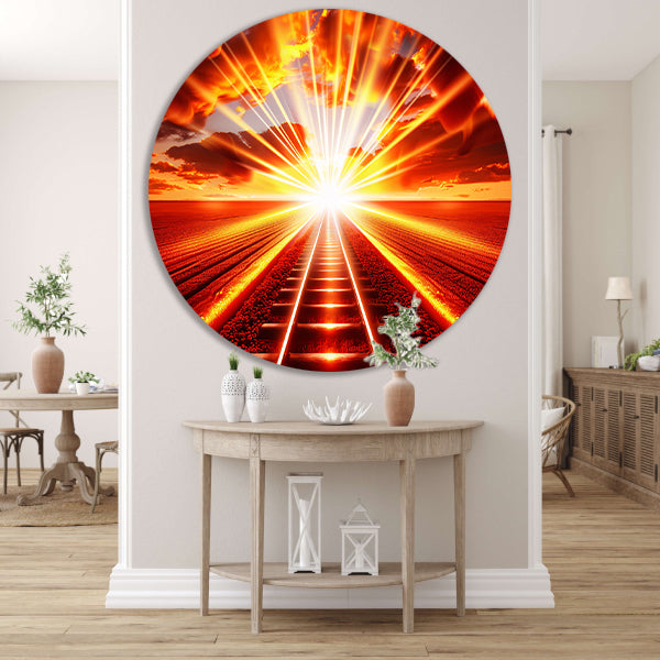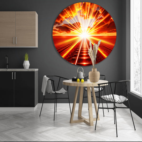 Breng een vleugje sfeer en emotie in huis met deze prachtige muurcirkel en geniet dagelijks van het betoverende beeld van een treinspoor bij zonsondergang. Perfect voor in de woonkamer, slaapkamer, kantoor of elke andere ruimte die wel wat extra sfeer kan gebruiken. Bestel deze muurcirkel vandaag nog en geef jouw interieur een unieke touch!