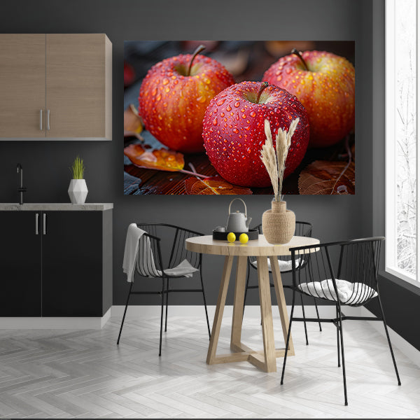 De levendige kleuren en gedetailleerde afbeelding maken deze kunstafdruk een echte blikvanger in elke kamer. Voeg een vleugje natuur en frisheid toe aan je interieur met deze prachtige acrylglas print van drie kleurrijke appels met dauwdruppels.