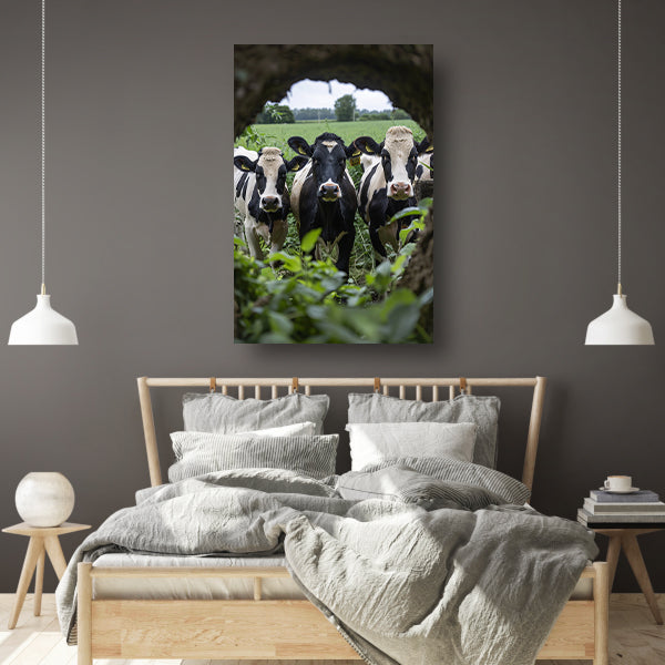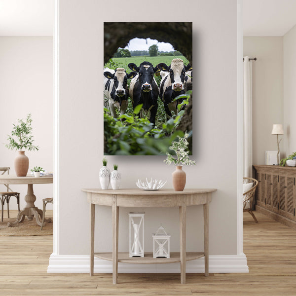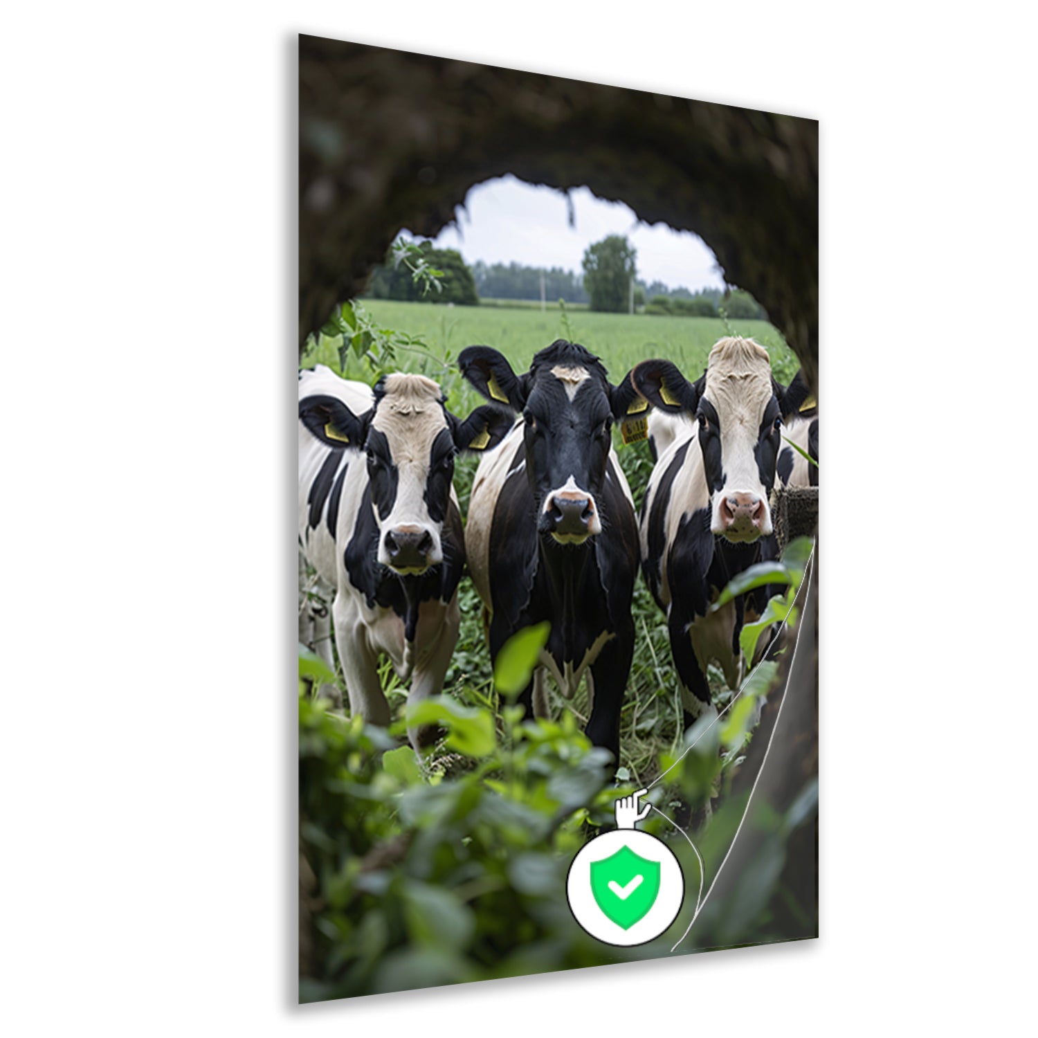 Drie zwart-wit koeien staren nieuwsgierig poster