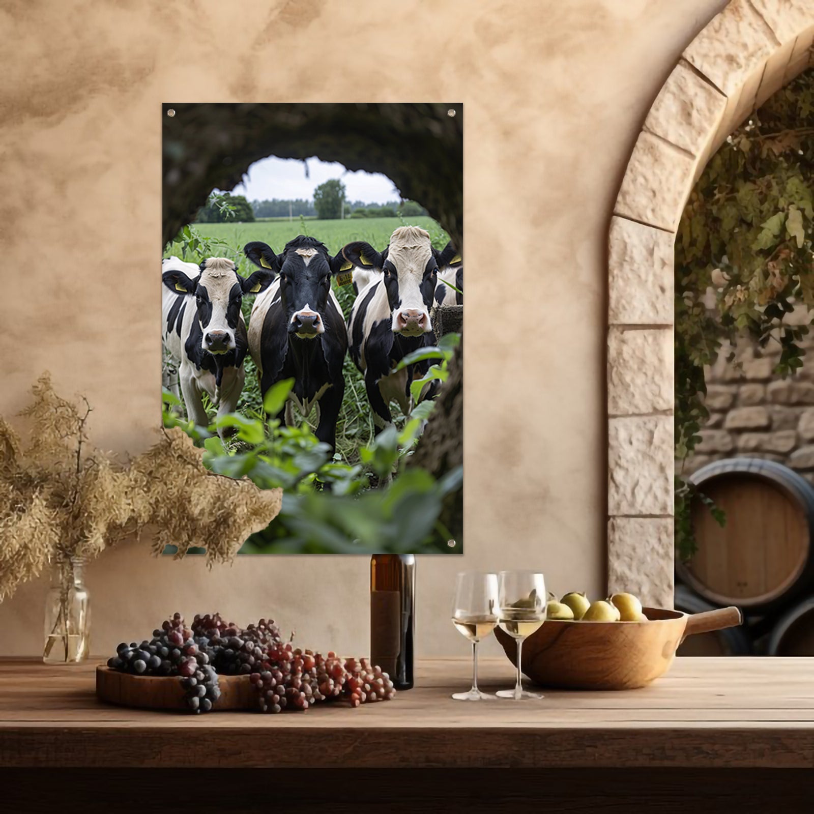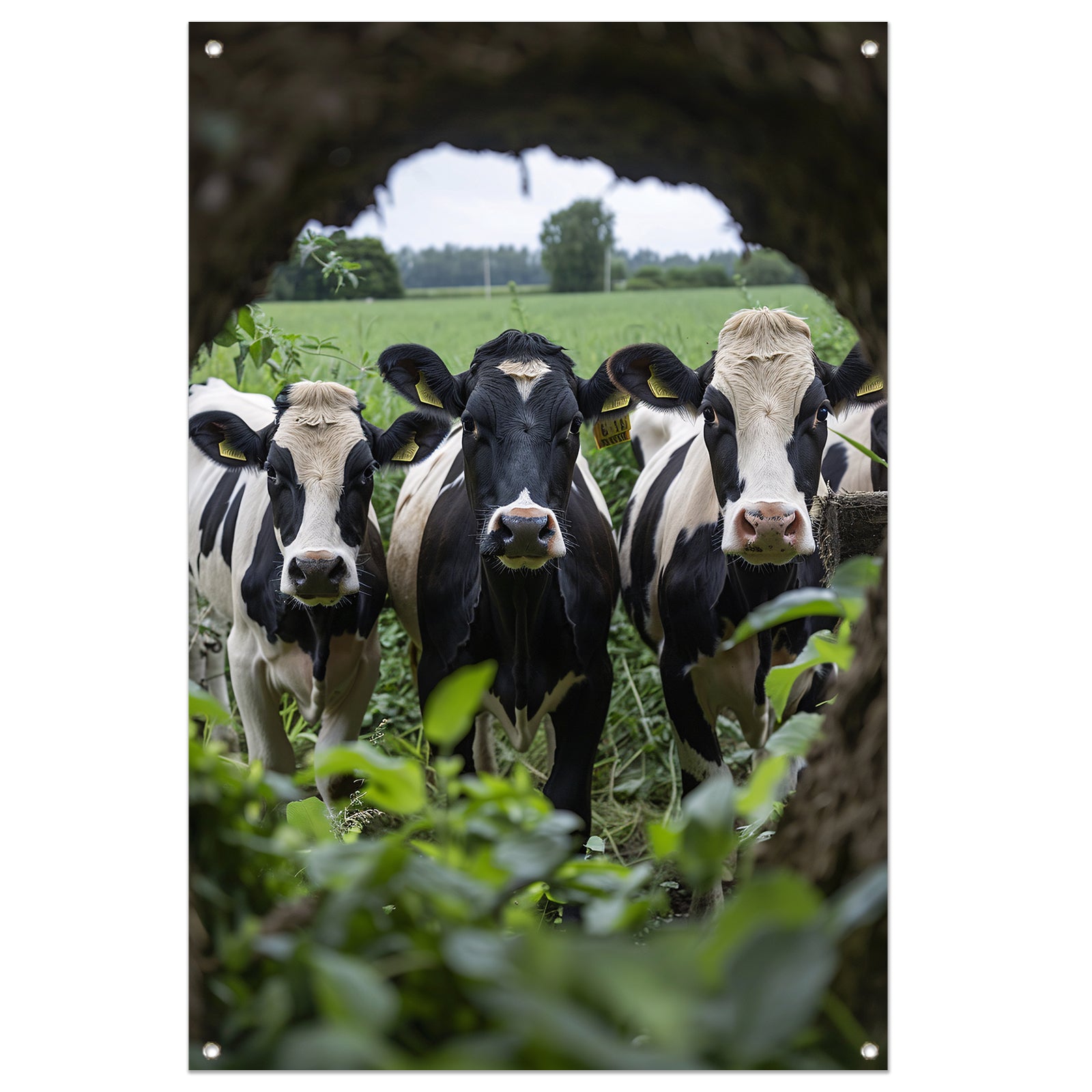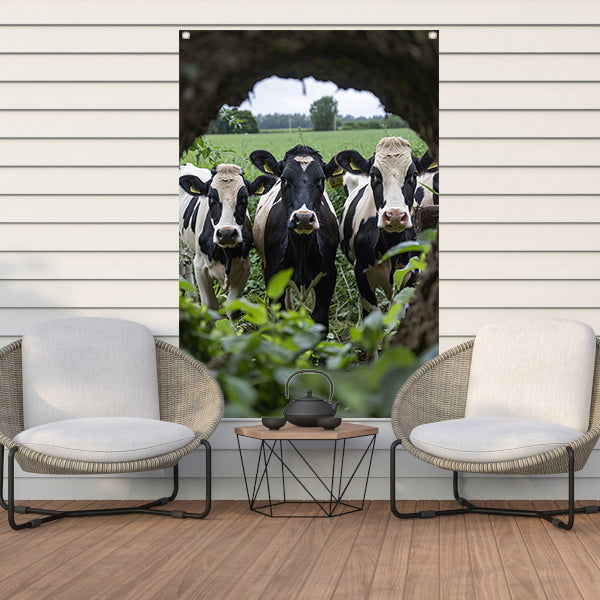 Drie zwart-wit koeien staren nieuwsgierig tuinposter
