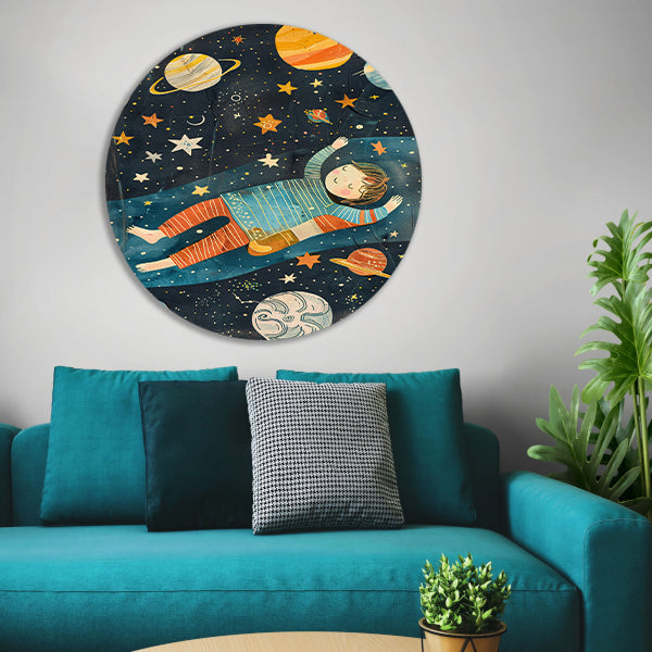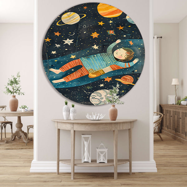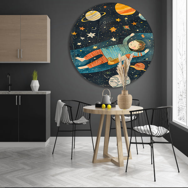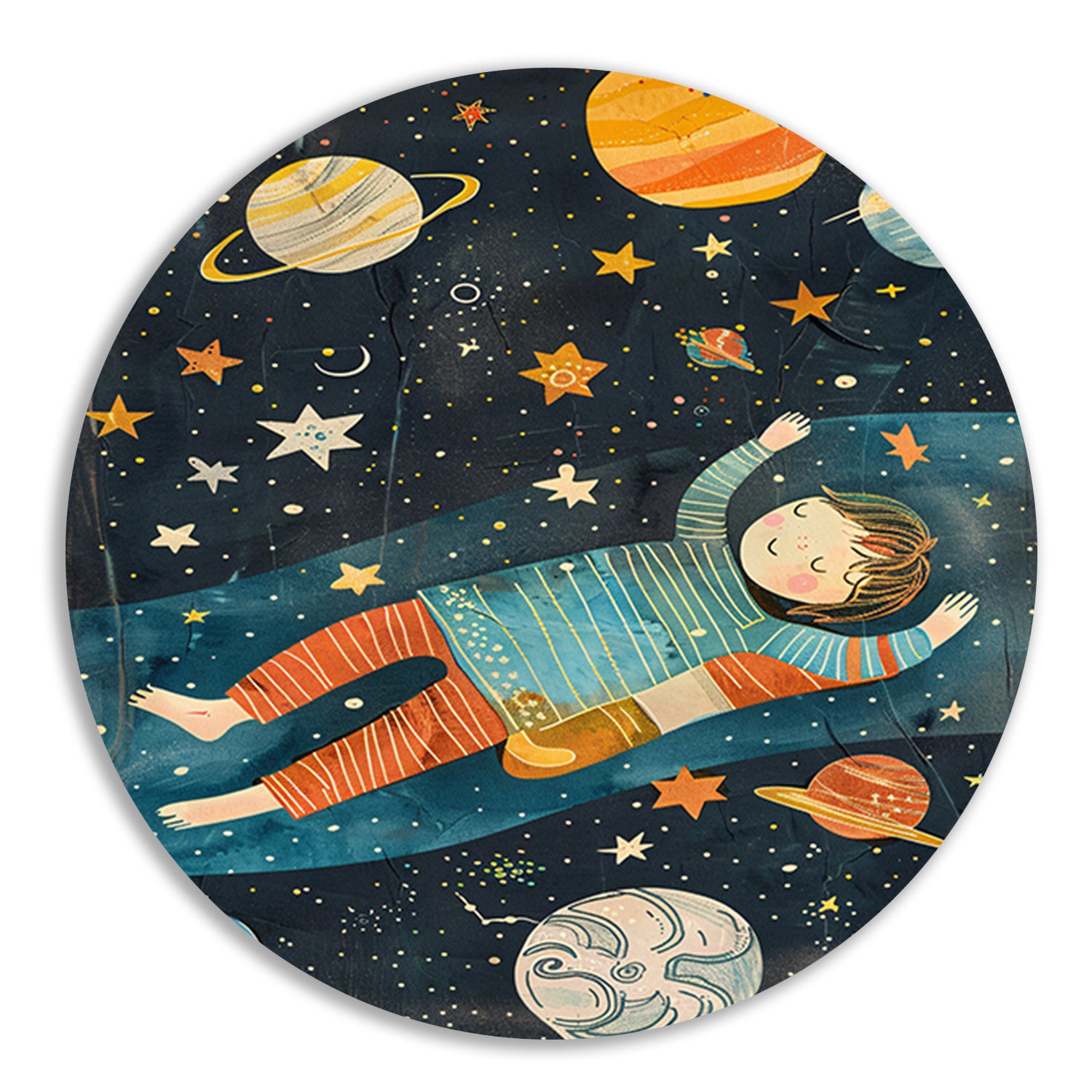 Dromend Jongetje in een Kleurrijk Heelal aluminium muurcirkel