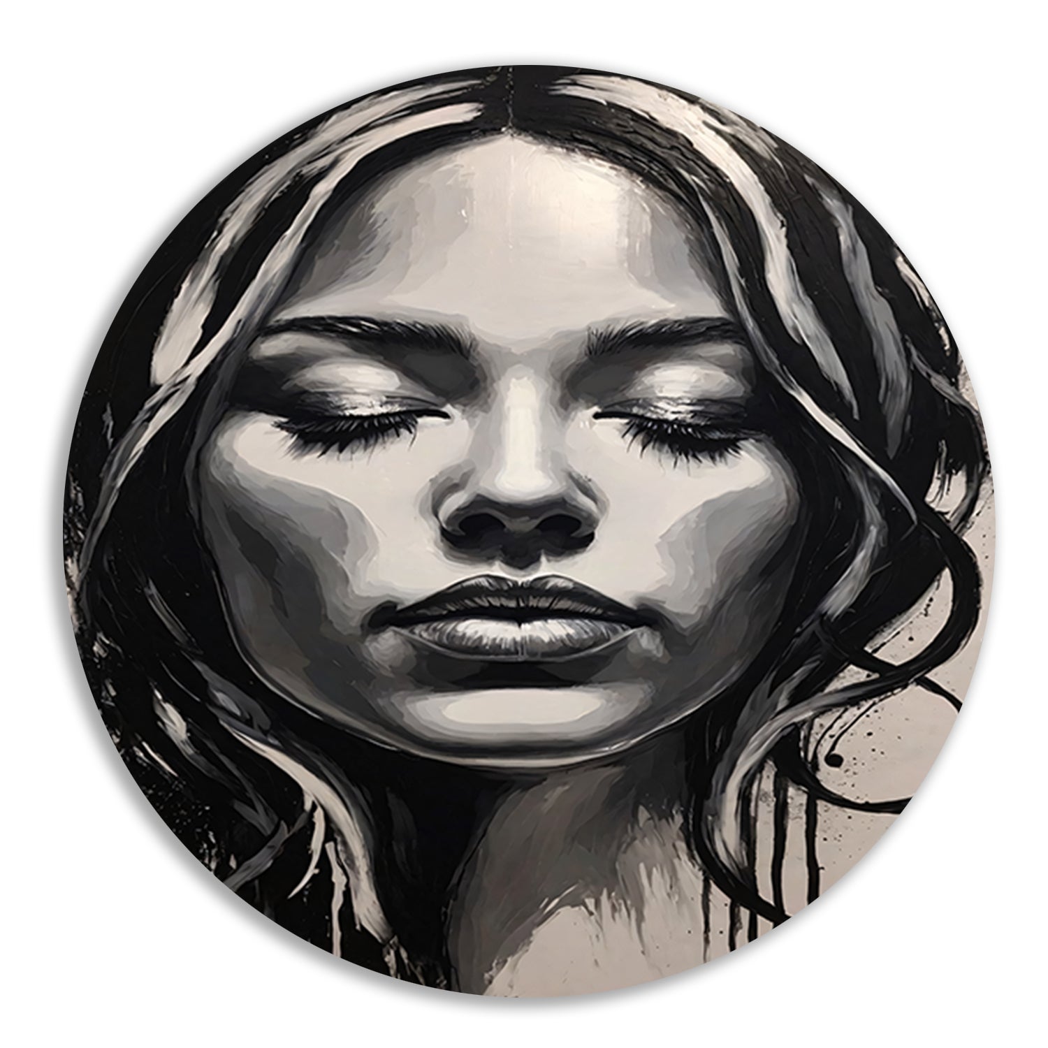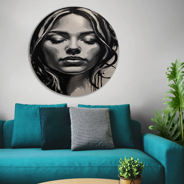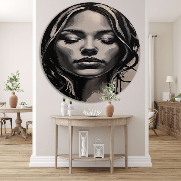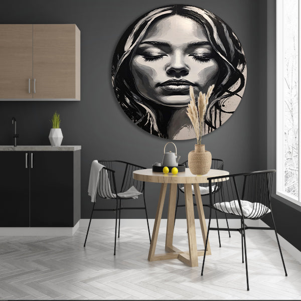 Breng een vleugje kunst en stijl in je huis met deze prachtige muurcirkel van een dromend vrouwengezicht in monochroom contrast. Bestel vandaag nog en geef je interieur een unieke en eigentijdse uitstraling!
