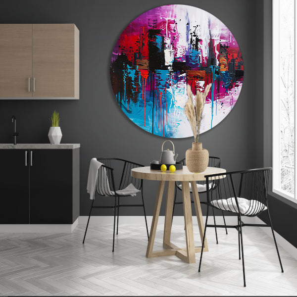Dynamisch abstract stadsgezicht in felle kleuren aluminium muurcirkel